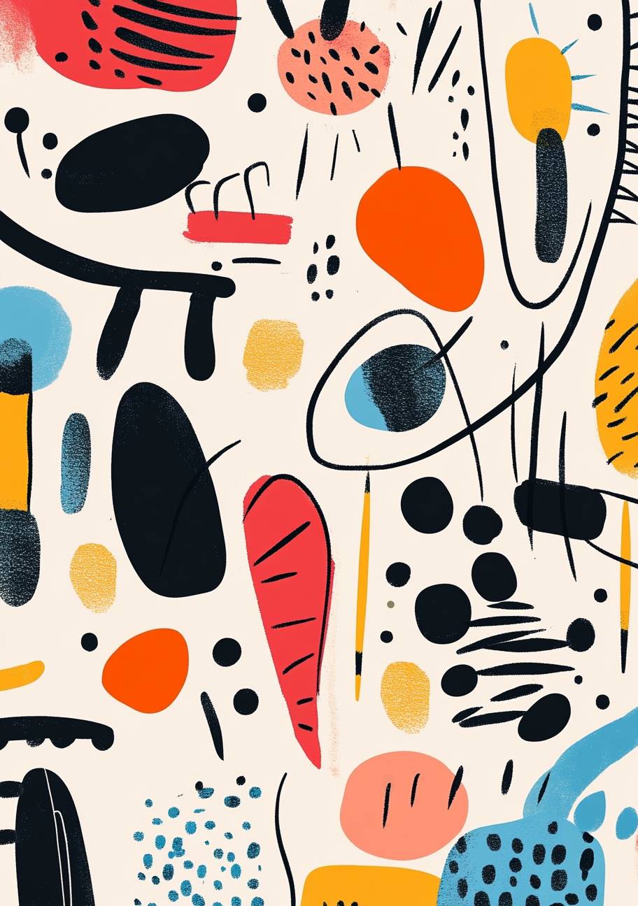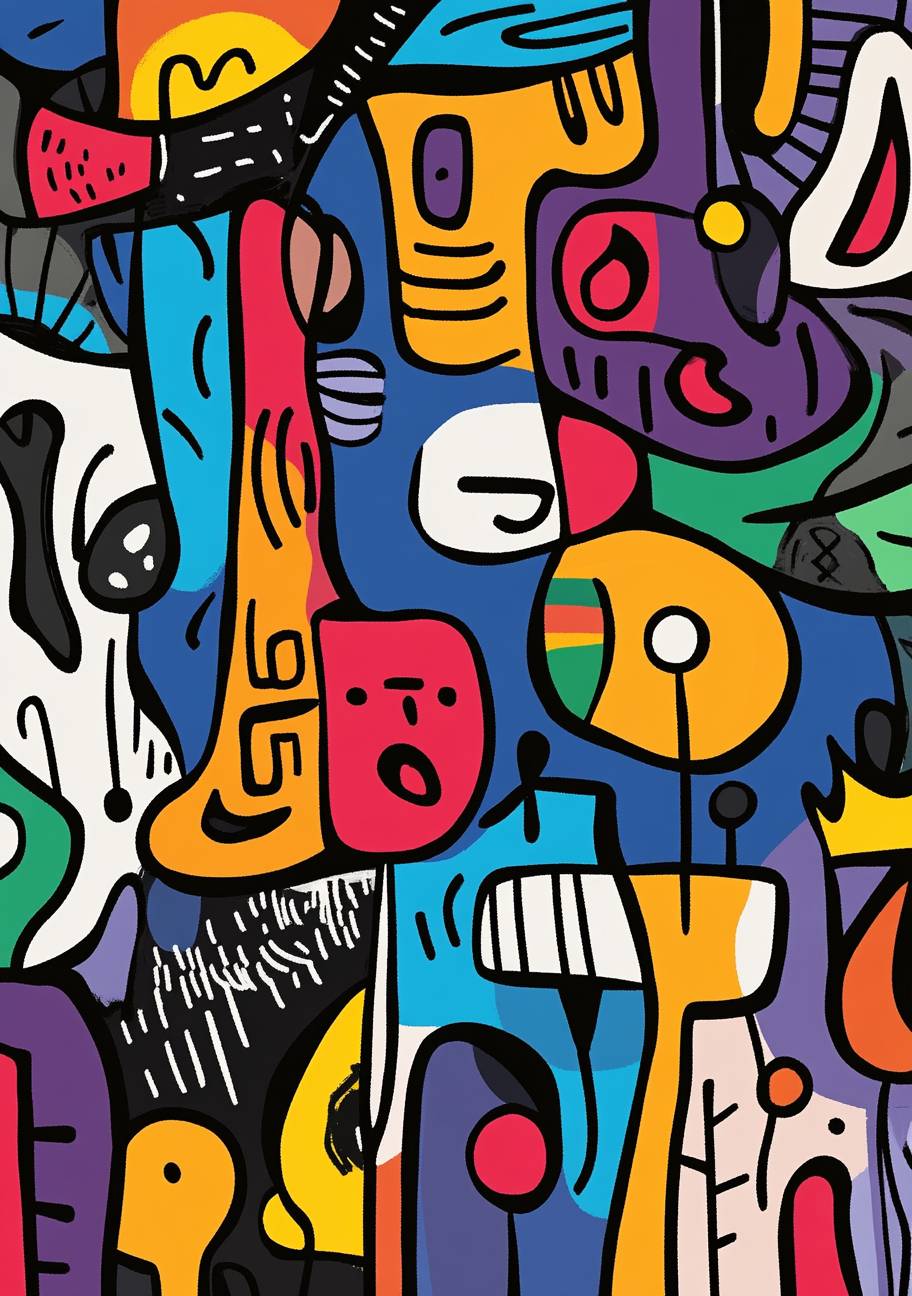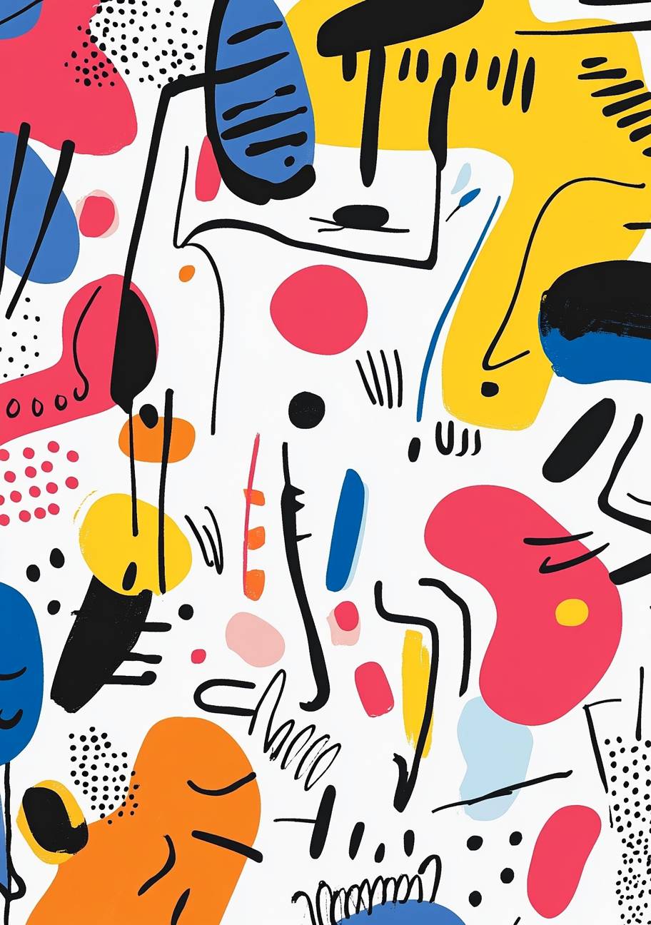 Abstract doodle, simple line art, with and thin lines, in a minimalist style, featuring whimsical shapes and child-like drawings with bright colors, and quirky characters in the background. --ar 43:61 --v 6.1