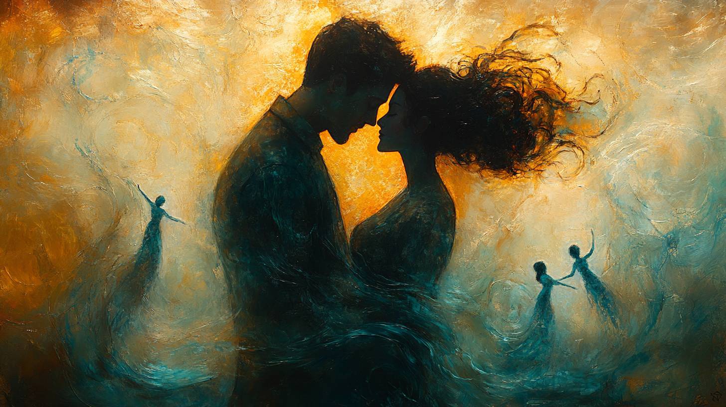 A surreal and dreamlike depiction of love inspired by Gustav Klimt and Marc Chagall, featuring a couple embraced in a golden, abstract landscape. The scene should blend Klimt’s intricate patterns with Chagall’s ethereal, floating figures, creating a composition that symbolizes the transcendence of love. --v 6.1 --ar 16:9 --style raw --stylize 1000
