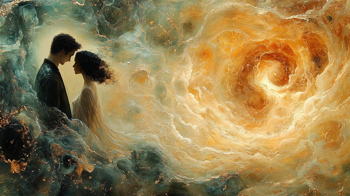 一个超现实梦幻般的爱情描绘,受古斯塔夫·克里姆特和马克·夏加尔的启发,展示了一对情侣在一个金色的抽象景观中相拥。场景应融合克里姆特的复杂图案和夏加尔的超然漂浮的形象,创造一个象征爱情超越的构图。