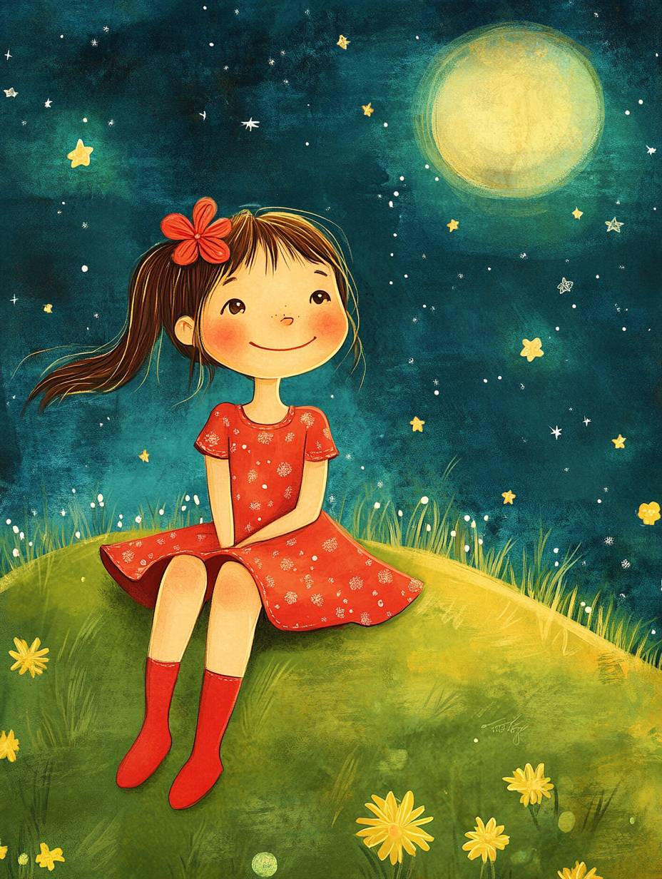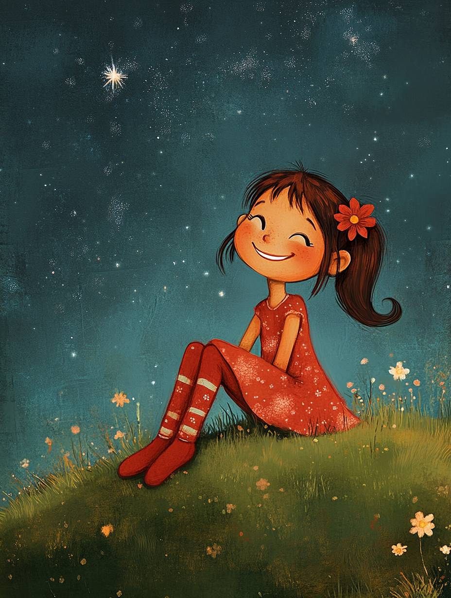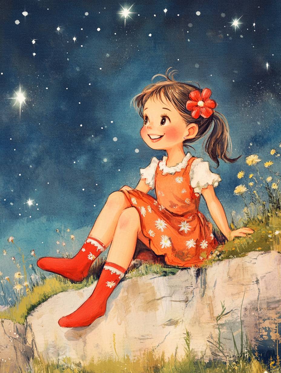 An illustration from a children's story. On a grassy hill in summer, a charming little girl is sitting smiling, wearing a red summer dress and red socks. She has a red flower hairpin, which holds her hair in a ponytail. Season of the year summer. She is sitting on the summer grassy hill of the canyon with a starry sky behind her, all in a whimsical fairy tale style --ar 3:4 --v 6.1