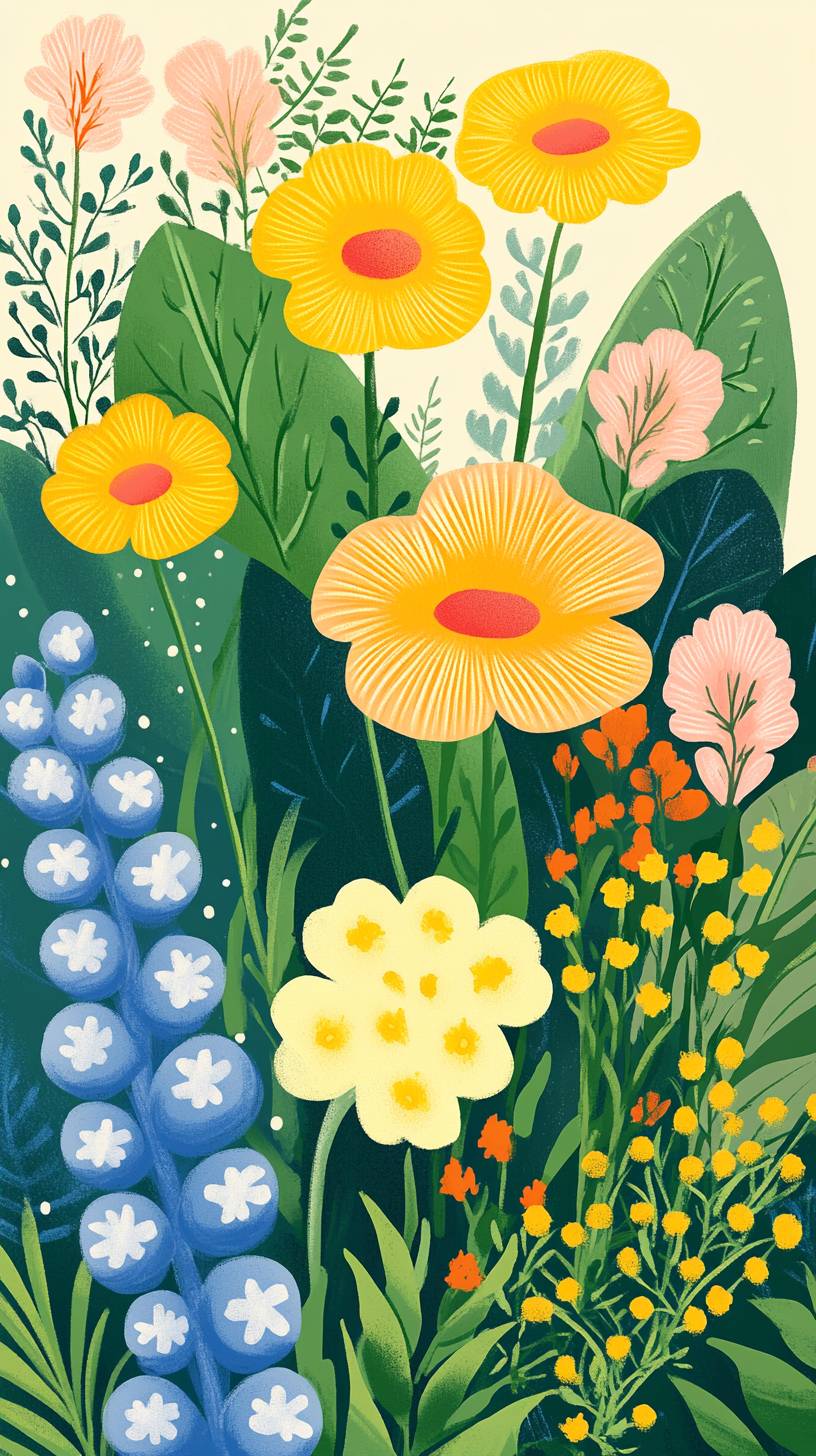 Vibrant, whimsical nature-inspired illustrations featuring bold brushstrokes, harmonious color palettes, and dynamic compositions that evoke a sense of joy and wonder --ar 9:16 --sref 949347912 4204914446 --stylize 200 --v 6.1