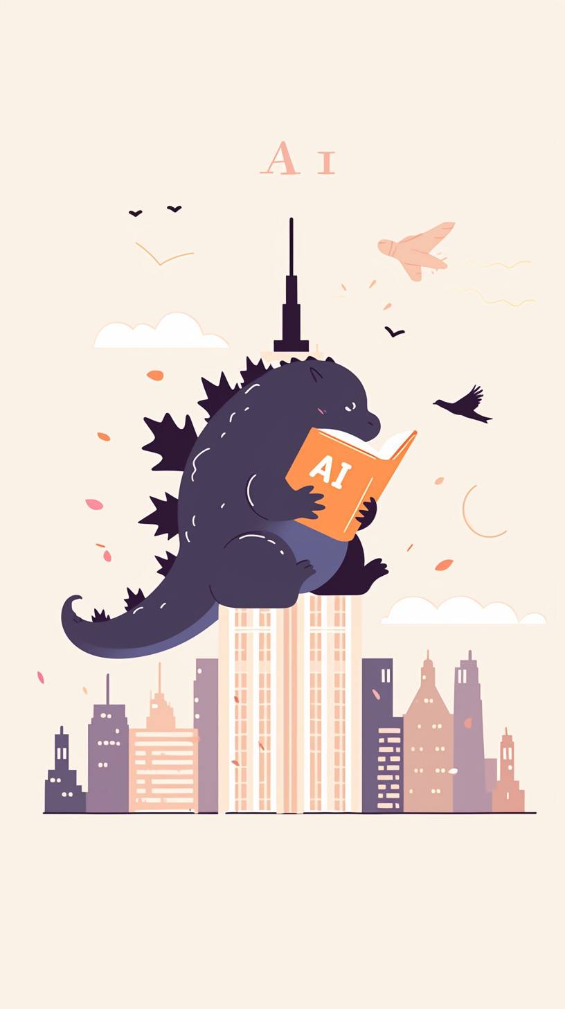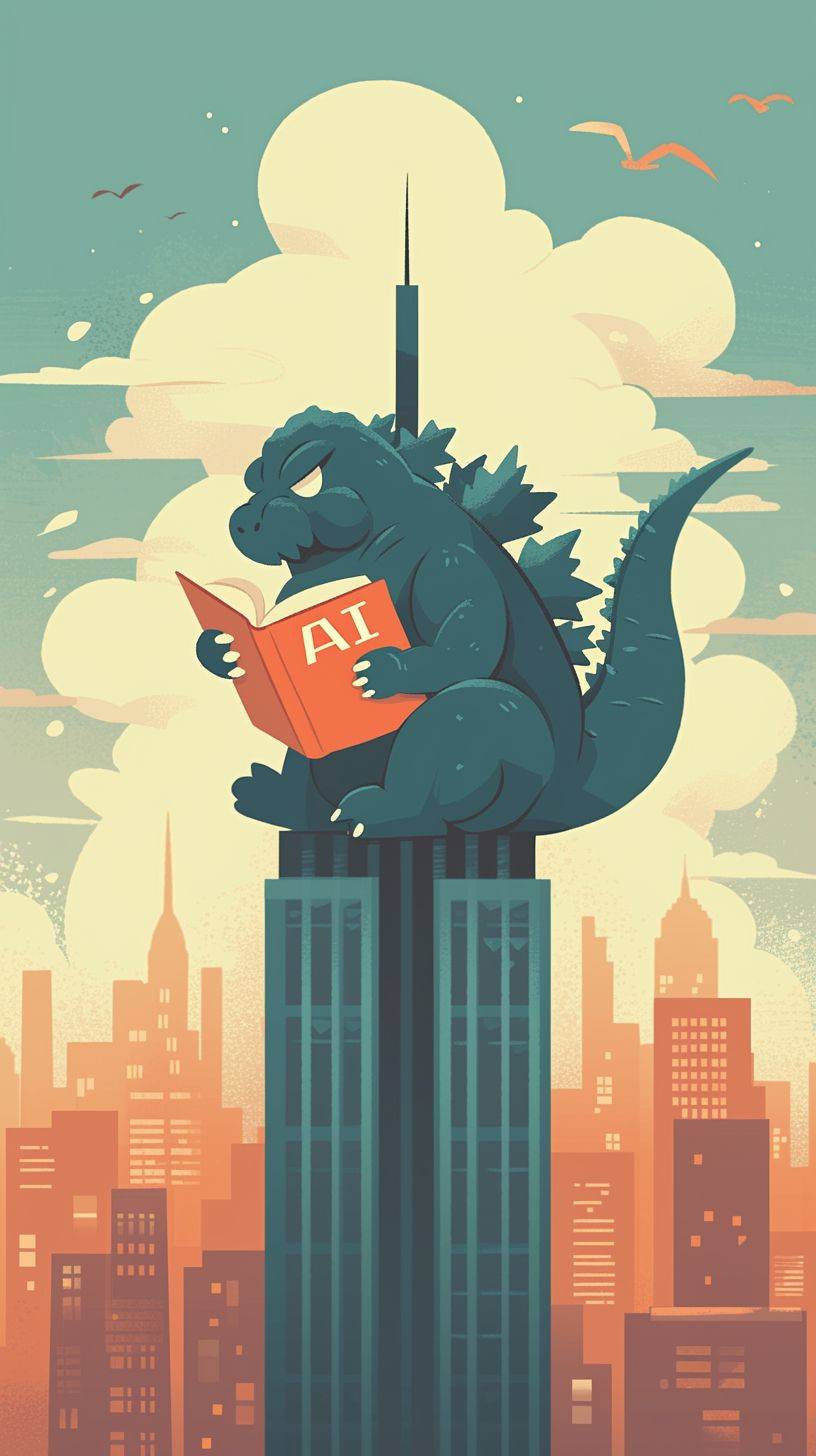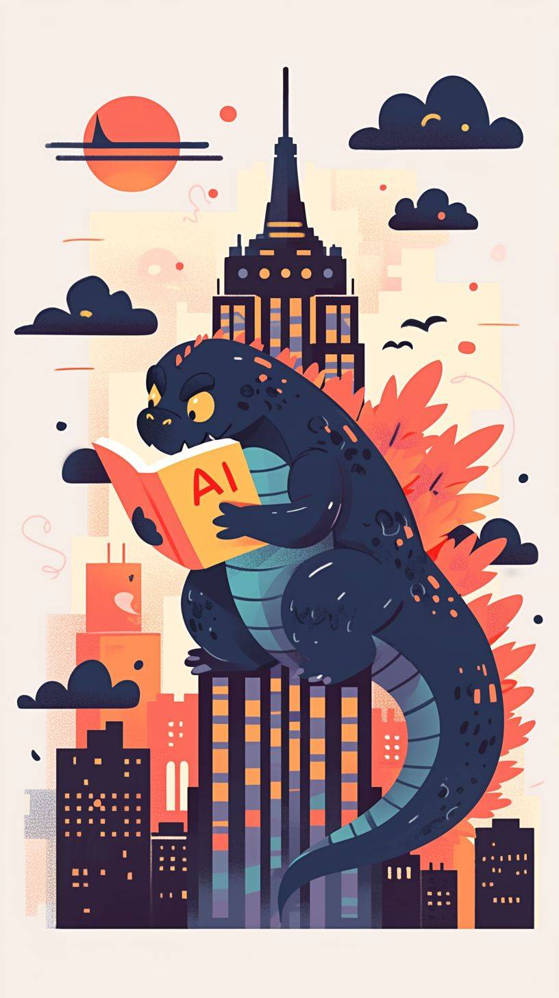 一只可爱的卡通哥斯拉正坐在帝国大厦上阅读一本书,头顶上方用粗体字写着“LOL”。