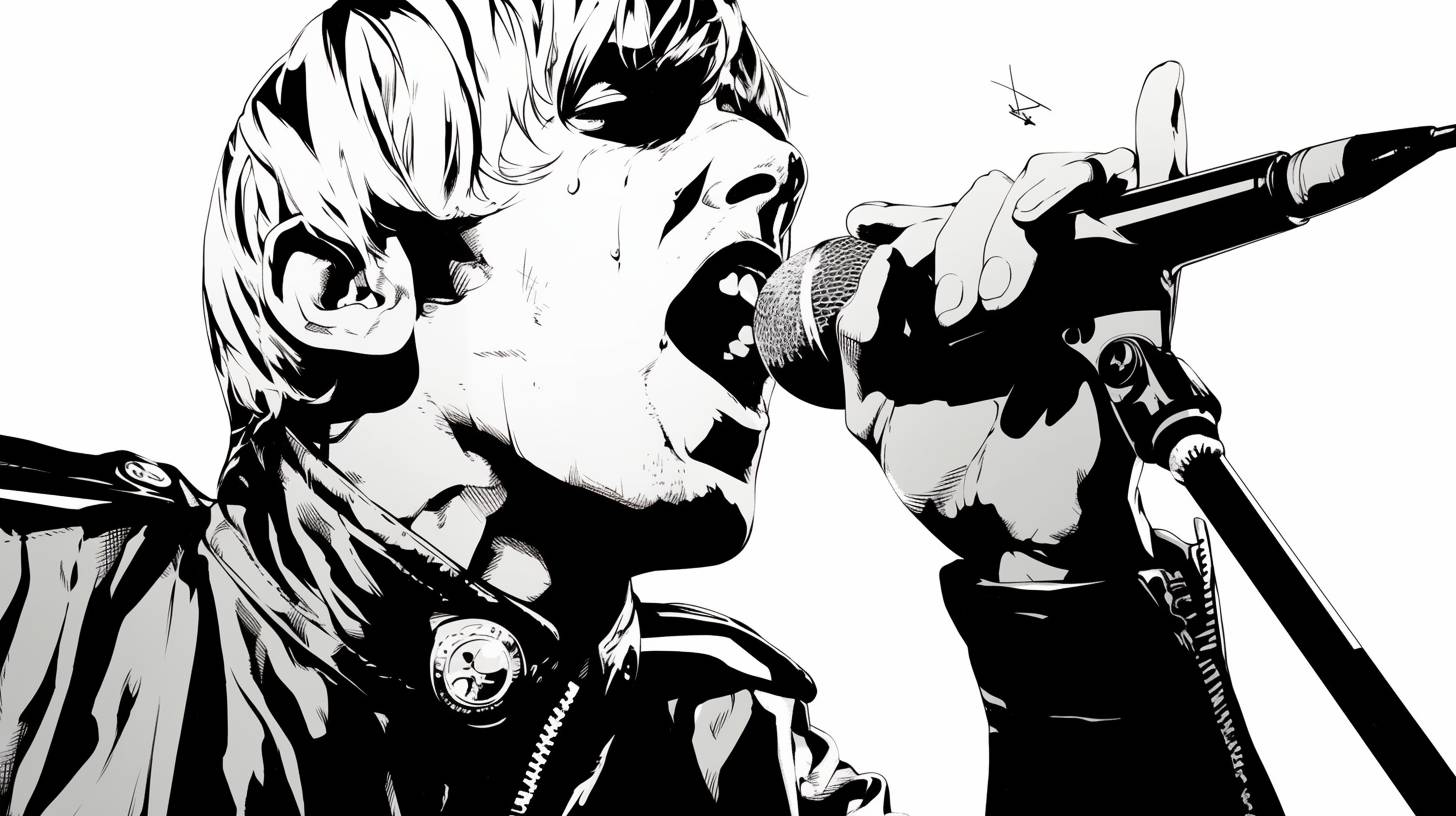 Liam Gallagher from Oasis music band singing, depicted in detailed manga, with comic book-style --ar 16:9 --style raw --niji 6