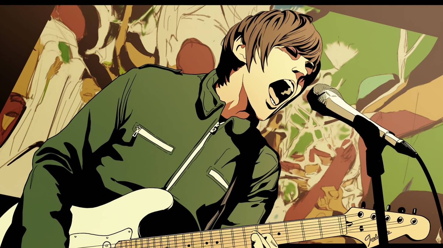 来自Oasis乐队的利亚姆·加拉格尔正在演唱,绘制成详细的漫画风格,采用漫画书风格。