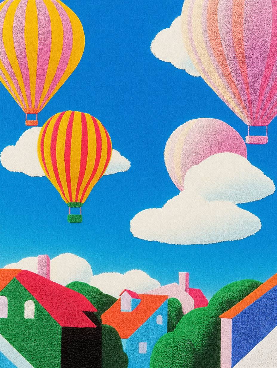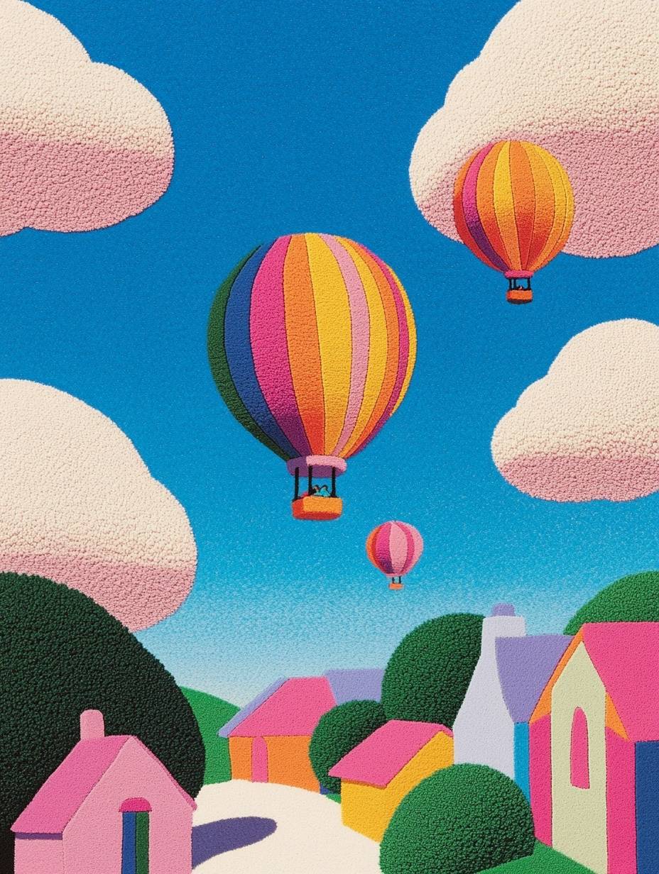 阳光明媚的天空,漂浮着蓬松的白云,五彩缤纷的房屋,大型热气球在空中飘荡。这幅作品由毛毡布制成,创造了一个可爱的场景,色彩柔和。这个描绘使用了鲜艳的粉彩色调,营造了愉快的氛围。
