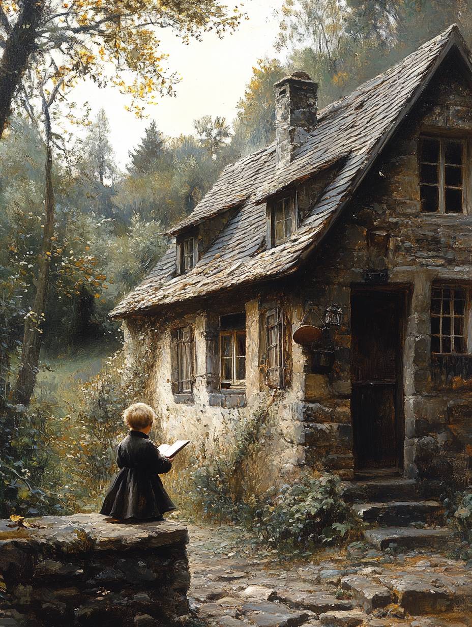 一个孩子学习的温馨时刻,融合了格吕兹的情感深度和安克的乡村魅力。场景应传达教育的永恒重要性。