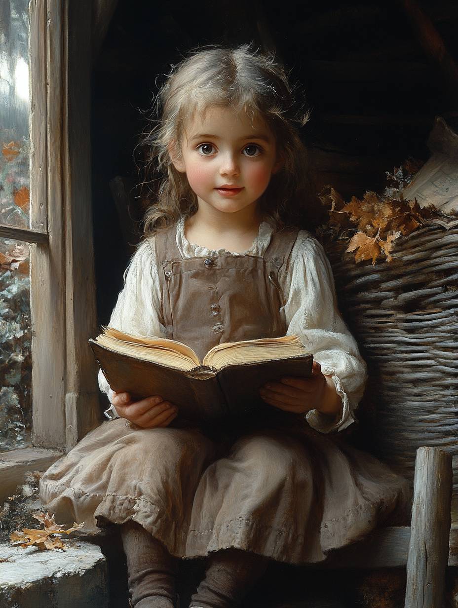 A tender moment of a child learning, blending the style of Greuze’s emotional depth and Anker’s rural charm. The scene should convey the timeless importance of education. --v 6.1 --ar 3:4 --stylize 1000