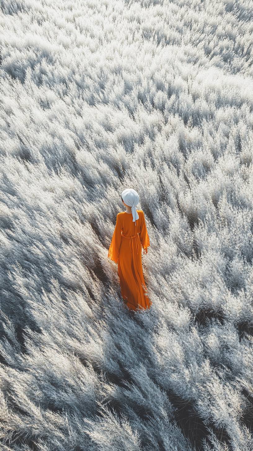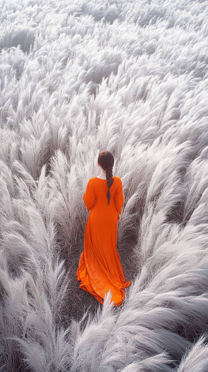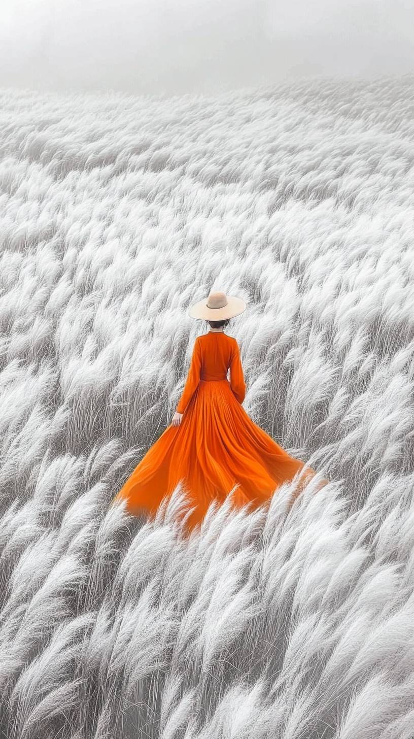 Aerial photography captures the vastness of silver grass in southern China, which appears endless. A orange Hanfu girl walks through the dense, white pampas grass, creating an immersive experience for the viewer. The depth of field effect gives the impression that one has been transported into the scene. --ar 9:16 --v 6.1