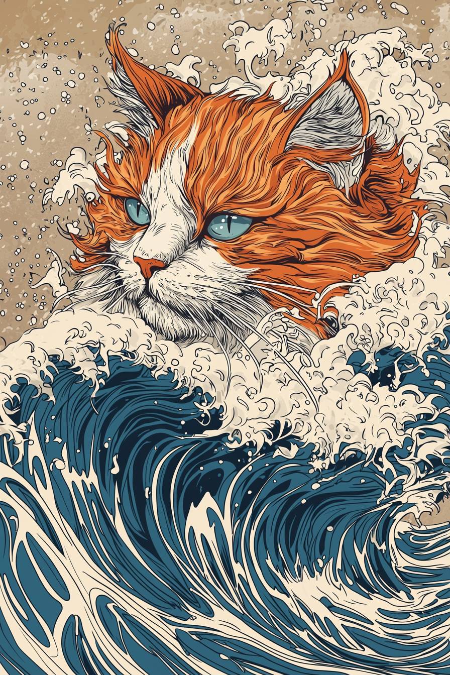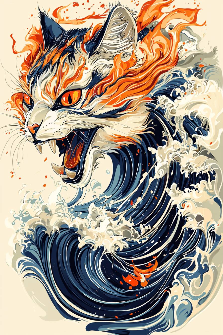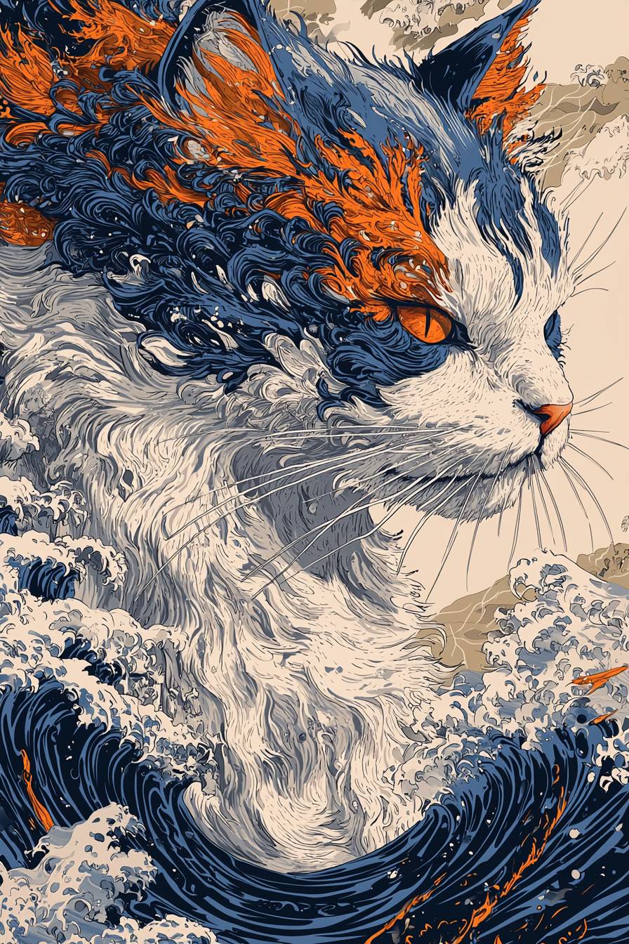 A Persian cat with the head of an orange and blue sea wave, in the style of Hokusai, poster art, vector design, detailed, hyper-realistic, highly intricate, dynamic composition, epic, in the style of James Jean and Gustave Doré. no text --ar 2:3 --quality 2 --v 6.1