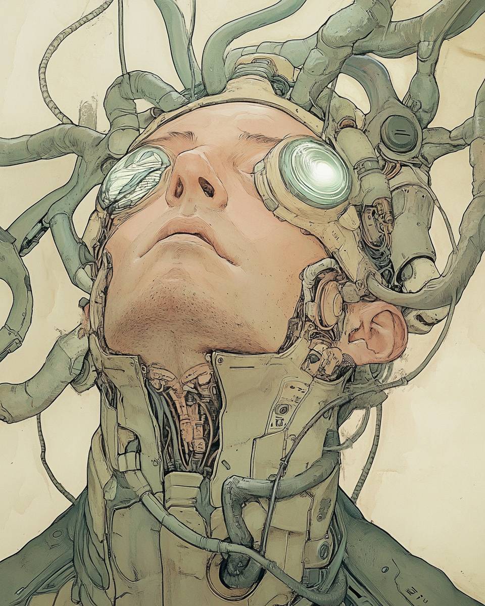 hyperrealism, semi-anime, an arcane subconscioussness monster, with a psychedlic aura with a double exposure, mind of a tormented man, 8k artstation Enki Bilal, Esad Ribic, Moebius, Tomer Hanuka, --ar 4:5 --style raw --personalize 157owae --stylize 50 --v 6.1
