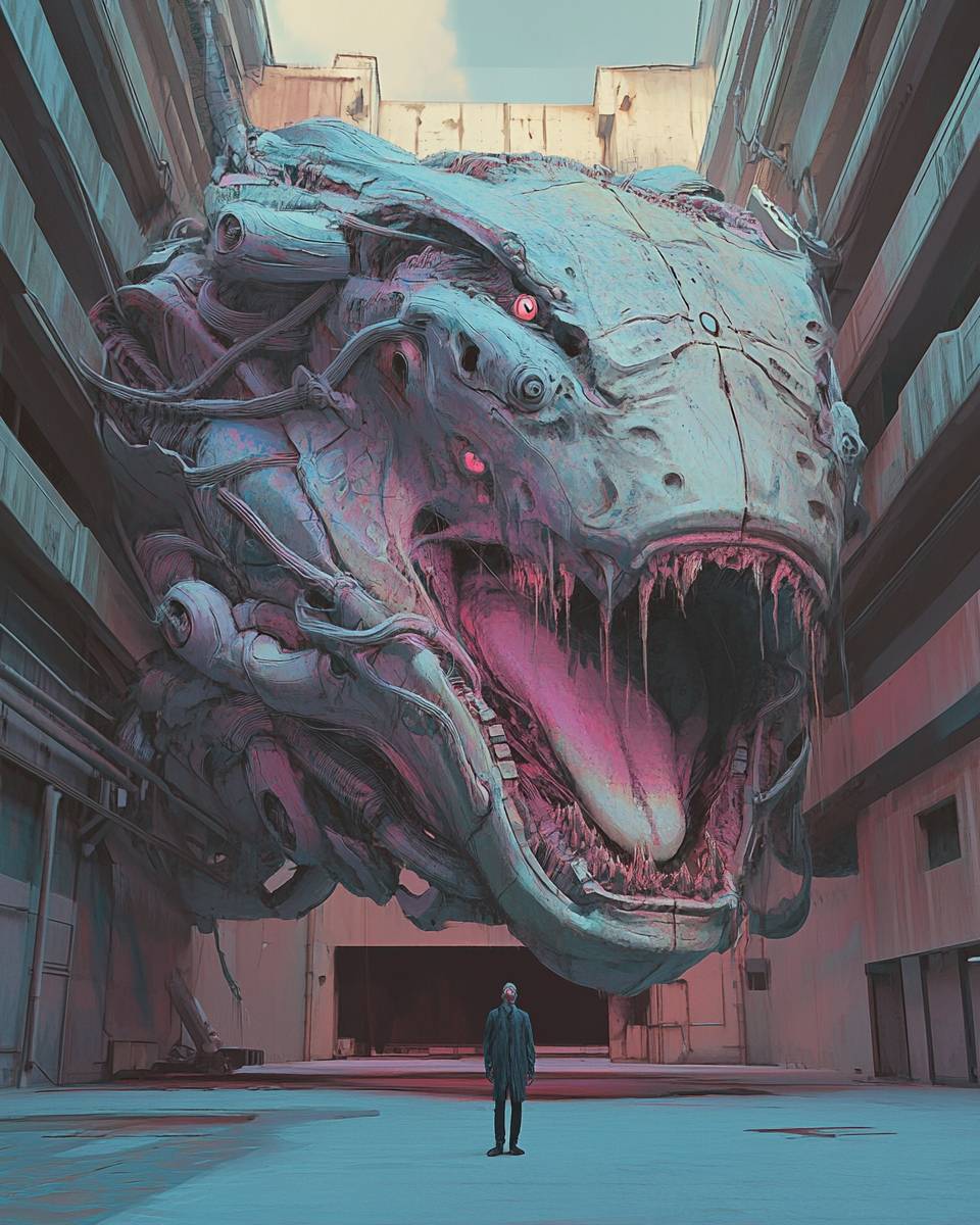 超写实主义,半动漫,一个神秘的潜意识怪物,具有迷幻的光环和双重曝光,一个被折磨的人的内心,8K艺术站,恩基·比拉尔,埃萨德·里比克,穆比乌斯,托默·哈努卡