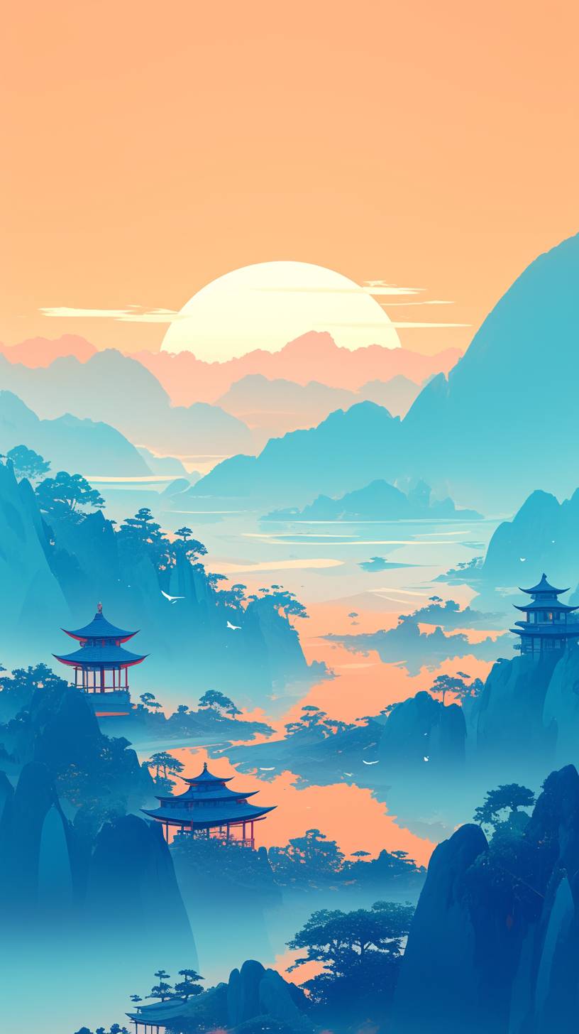 Colorful gradient background, cartoon Chinese architecture, mountains and rivers in the distance, a color scheme of golden, blue, and green, vector graphics, Gold Stroke, simple lines, minimal details, high definition, high resolution, high detail, best quality, high definition, high detail, best picture quality, wallpaper in the style of Chinese artists. --ar 9:16 --niji 6