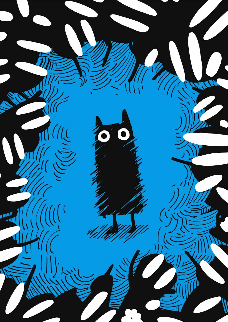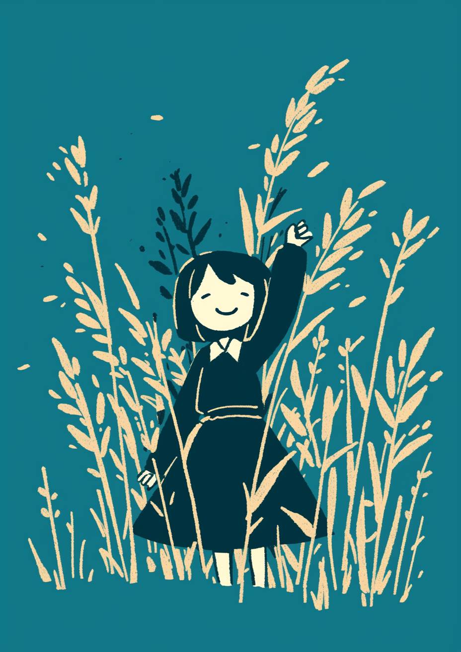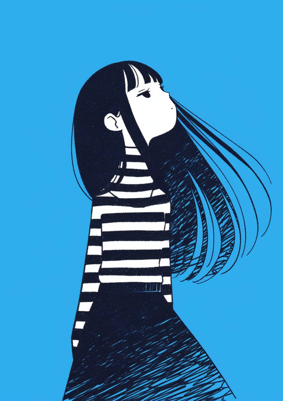 米粒形象插画,蓝色背景,基思·哈林风格涂鸦,记号笔插图,中线和单色,简单细节,极简主义。