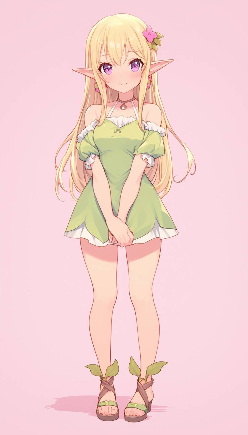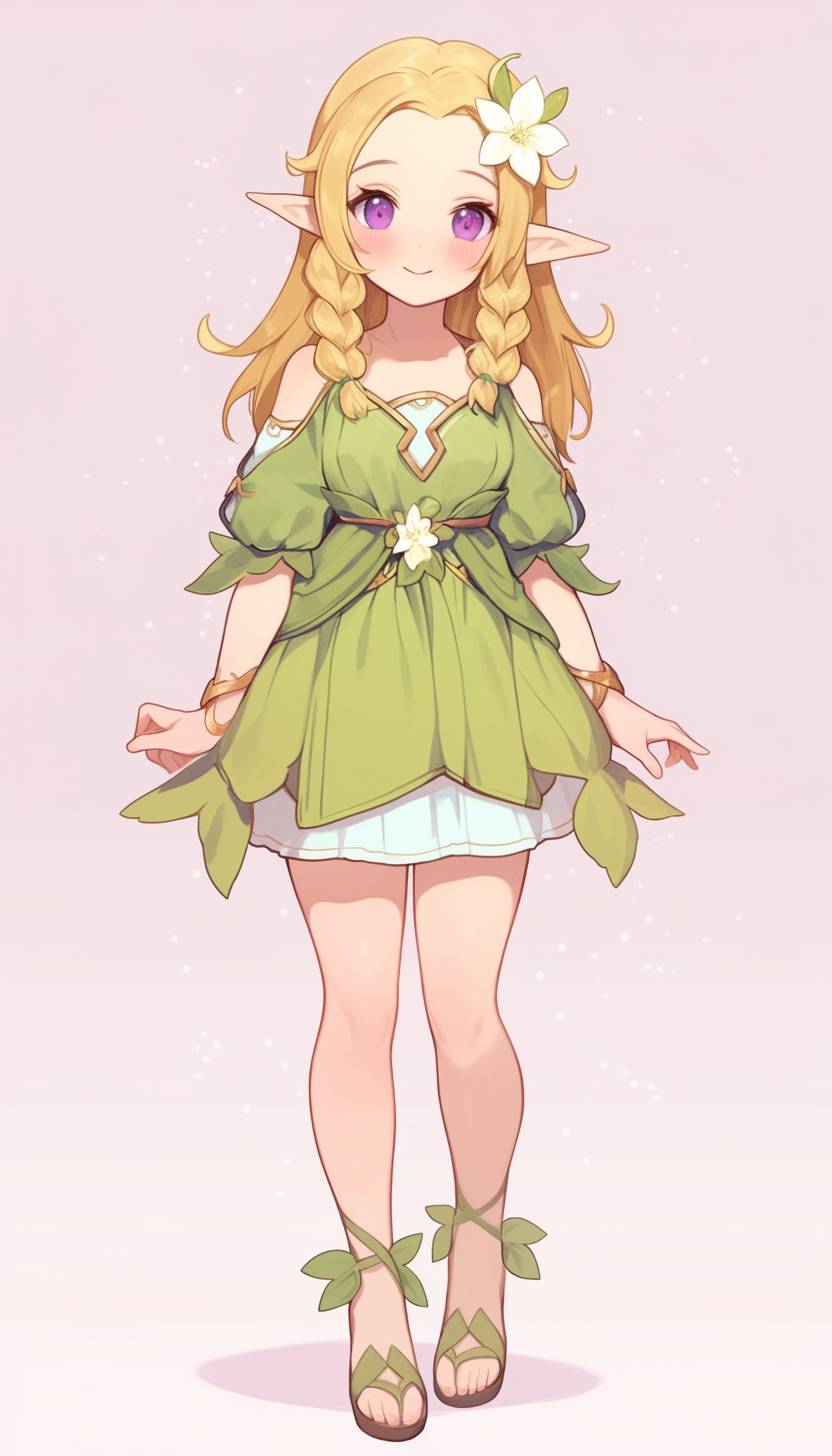 A cute elf girl with blonde hair and purple eyes, wearing a green dress and leaf-shaped shoes, smiling softly. The background is a plain light pink, with simple lines forming the character's full body shape. She has blonde pigtails and wears a small flower on her forehead. Her expression exudes warmth and friendliness as she stands upright in an adorable pose. --ar 73:128 --niji 6