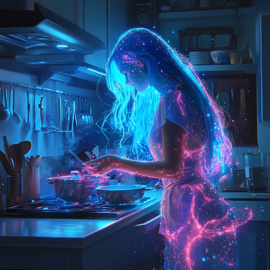 在午夜时分,发光的霓虹女孩在厨房显现,照亮了台面和电器,她由闪闪发光、如糖般的粒子组成,像小吃一样诱人。