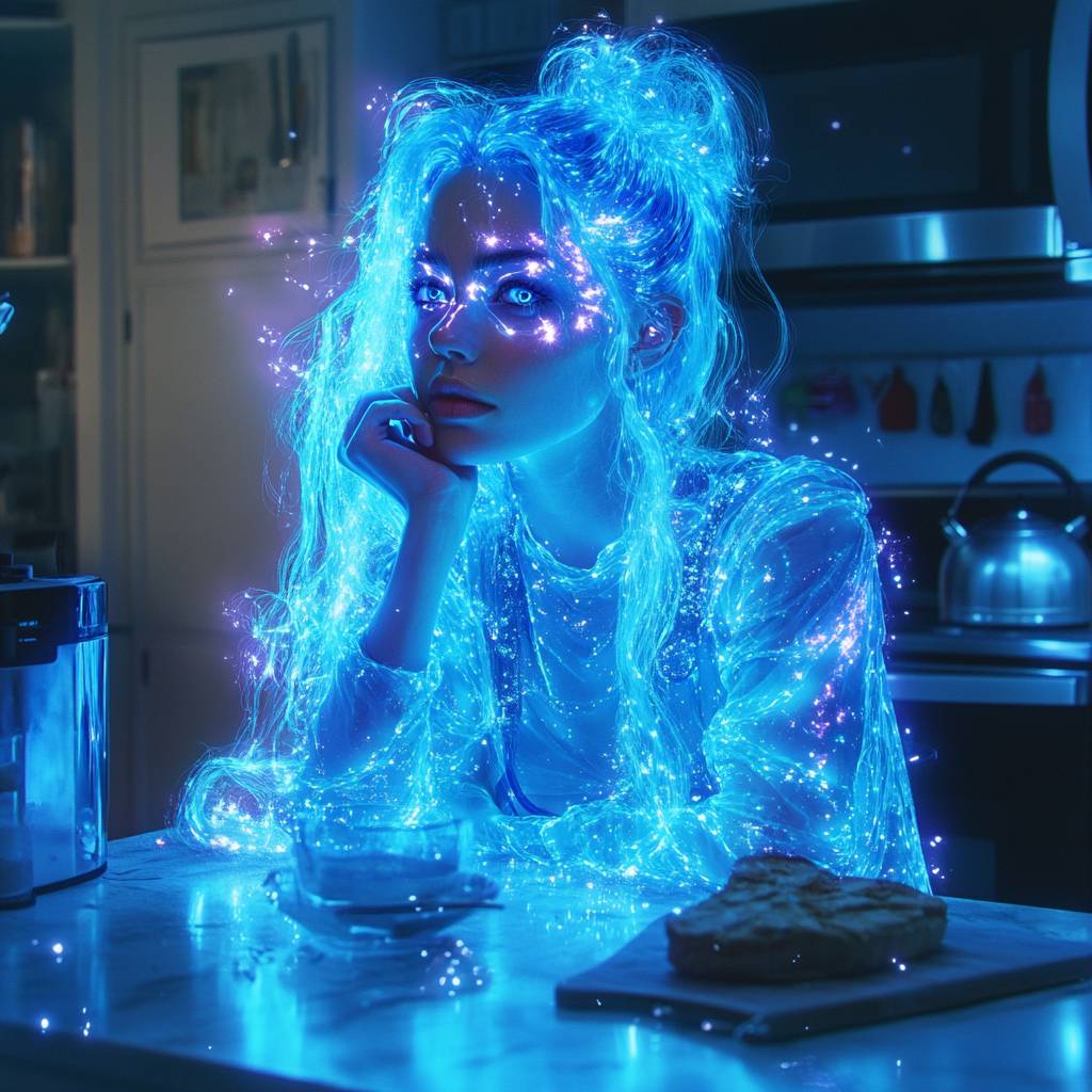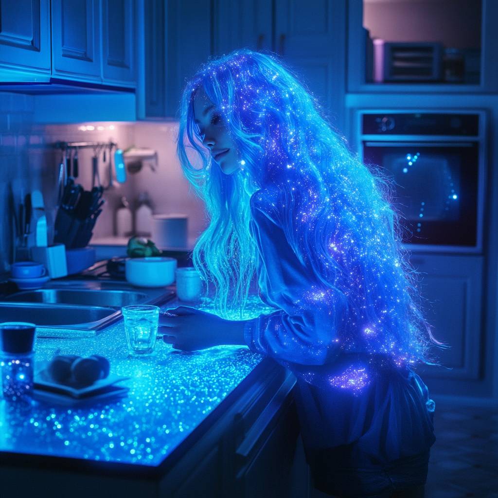 Neon radiant girl with luminescent form and electric blue hair, materialized in the kitchen at midnight, illuminating the countertops and appliances, composed of glittering, sugar-like particles, inviting as a snack.