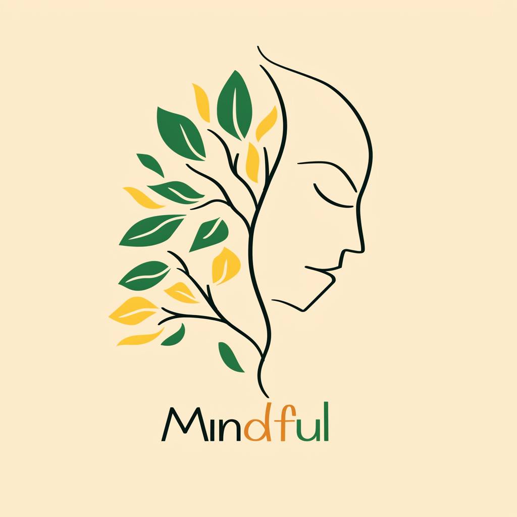 minimalist logo for a psychologist showing a pensive face and a tree and the text "Mindful", abstract line art, vector illustration simple flat style design, beige background, green and yellow color palette, simple one-line vector illustration in the style of psychology design --ar 2:2 --niji 6 --style raw