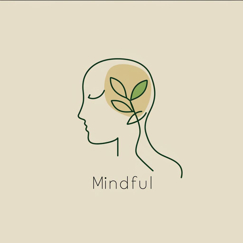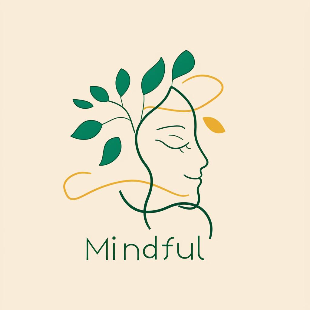一个极简的心理学家标志,展示一个沉思的面孔和一棵树,文本为“Mindful”,抽象线条艺术,矢量插图,简单的平面设计,米色背景,绿色和黄色调,简单的一笔矢量插图,符合心理学设计风格。