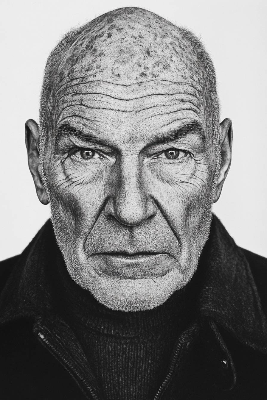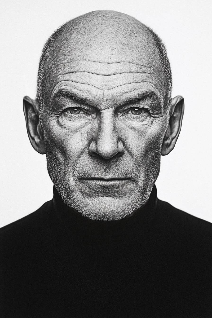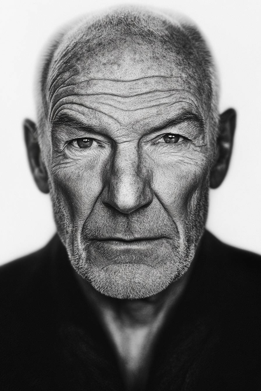 Photo realistic very detailed black and white art portrait of Patrick Stewart by Annie Liebowitz Richard Avedon, flat white background, immense details --ar 2:3 --v 6.1