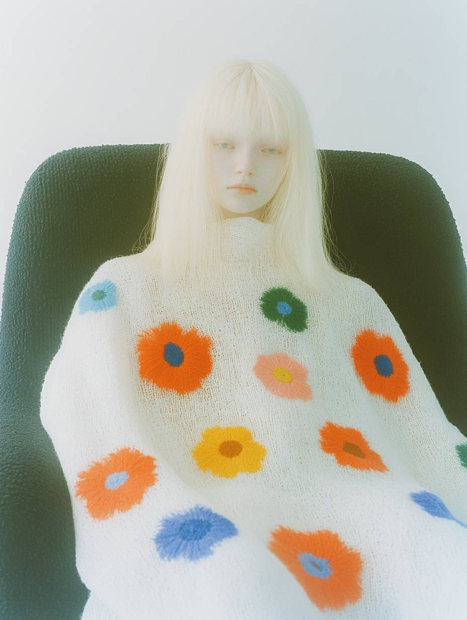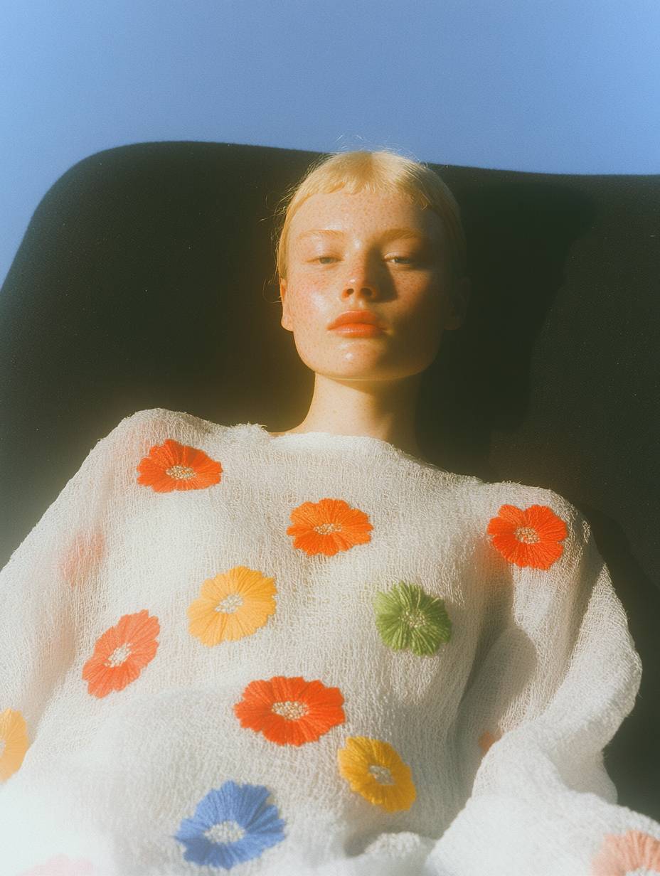A girl wearing a white gauze dress embroidered with colorful flowers sits on a black sofa in a studio background, styled after Tim Walker and James Bidgood. --ar 3:4 --sref 962970979 4111512974 2581180571 --personalize kzilt9y --stylize 900 --v 6.1