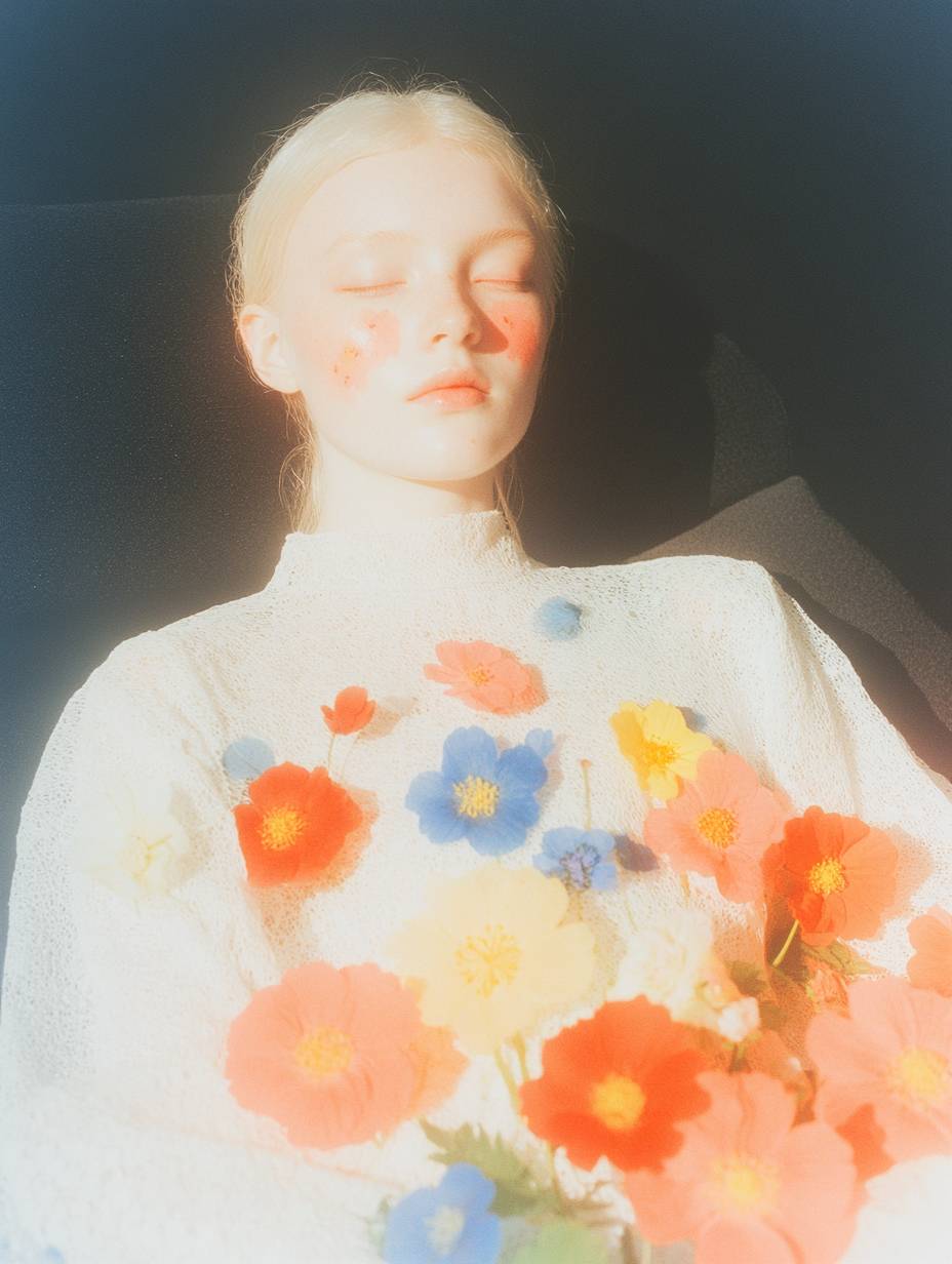 一个穿着白色薄纱裙、绣有五彩花朵的女孩坐在一个黑色沙发上,背景是受Tim Walker和James Bidgood风格影响的工作室。
