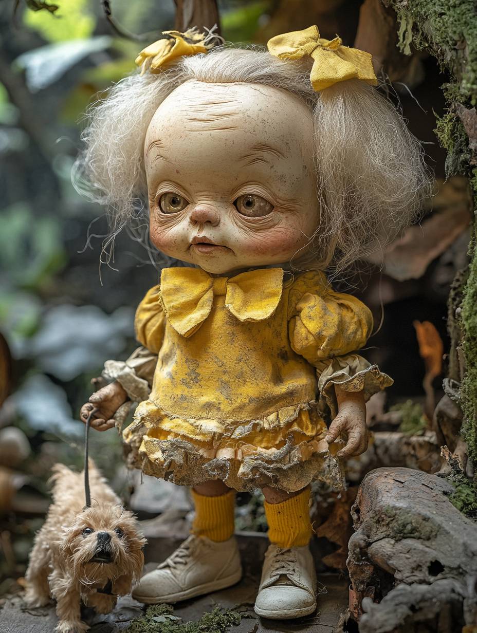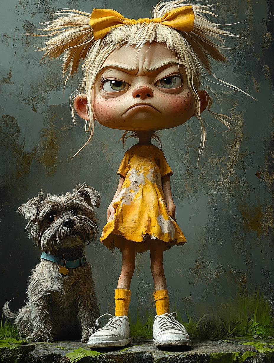 A Whimsical, caricature image of a cute, doll-like, little old wordly girl with a large forehead, chubby cheeks, blonde messy hair in high pigtails with pale yellow bows and a cute yellow flowery dress, white sneakers, yellow socks, she is standing tall with a scruffy dog, jumping in the air, beautiful surreal garden, grunge bg, --chaos 50 --ar 3:4 --stylize 700 --v 6.1