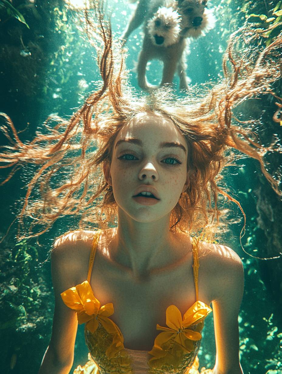 一个异想天开的卡通形象,描绘了一位可爱的、央央的、充满世俗气息的小姑娘。她有着宽大的额头、圆润的脸颊、凌乱的金色双马尾,搭配着淡黄色的蝴蝶结,穿着一条可爱的黄色花裙子,白色运动鞋,黄色袜子。她与一只毛躁的小狗一起高高跳起,身后是美丽的超现实花园,背景有些粗糙。