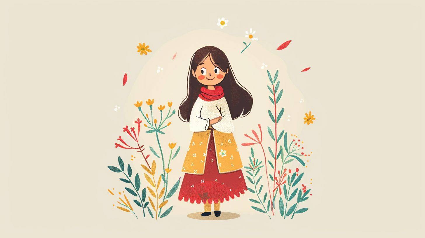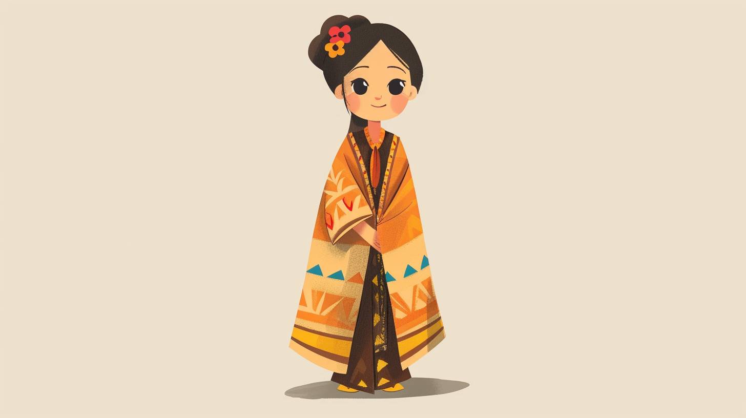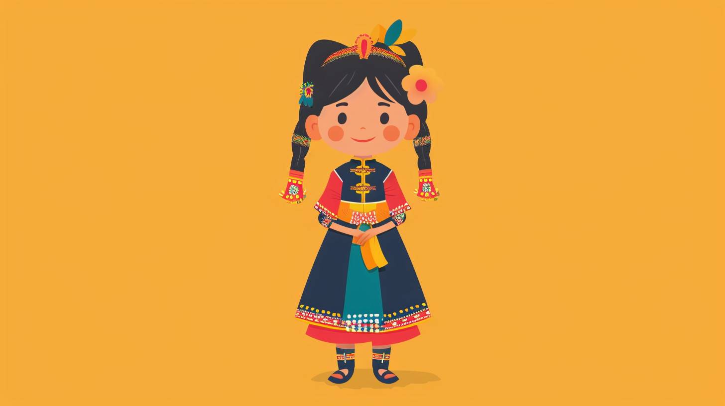 full body shot illustration of a little beautiful [Subject] in a traditional [country], [clothes], [hair], cartoon style, flat drawing, vector, minimal [color] Background. --ar 16:9