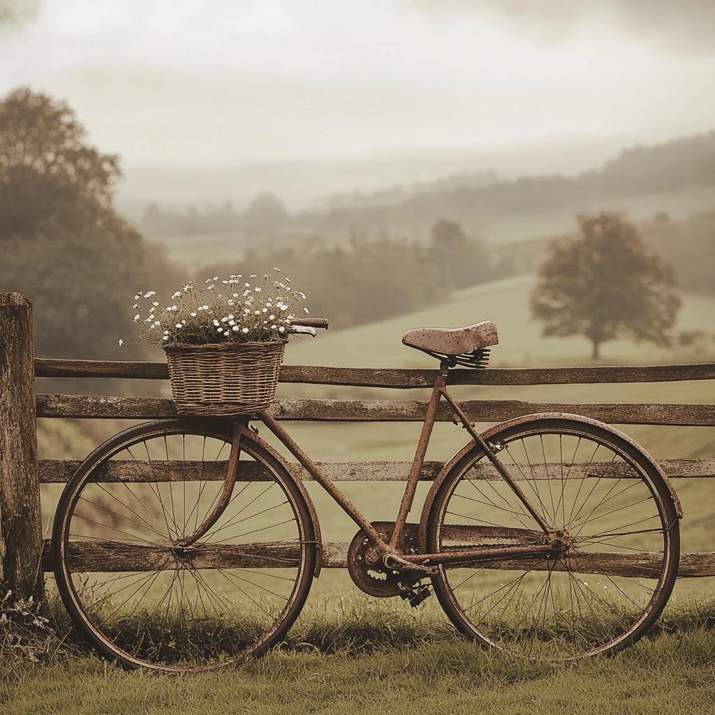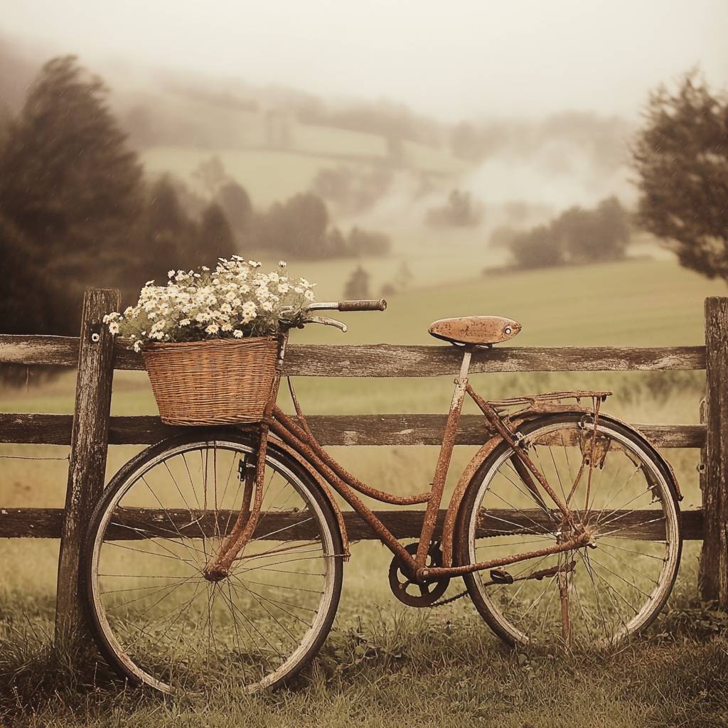 一张复古的褐色照片,展示了一辆锈蚀的自行车停靠在木栅栏旁。自行车的车把上有一个盛满野花的柳条篮子。自行车框架上挂着露珠。背景是一幅朦胧的风景,有起伏的山丘和树木。