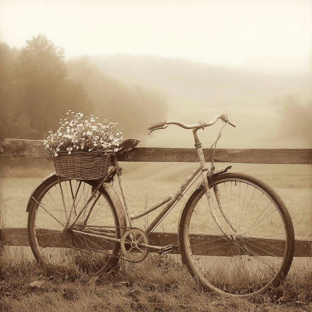A vintage sepia photograph of a rusty bicycle parked against a wooden fence. The bicycle has a wicker basket filled with wildflowers on the handlebars. There are dew drops on the bicycle frame. The background is a misty landscape with rolling hills and trees. --v 6.1