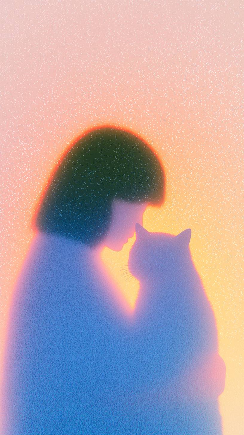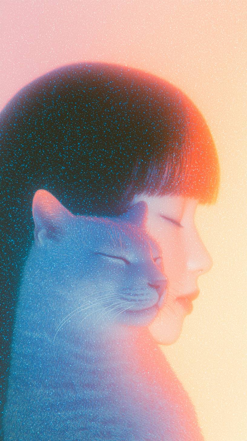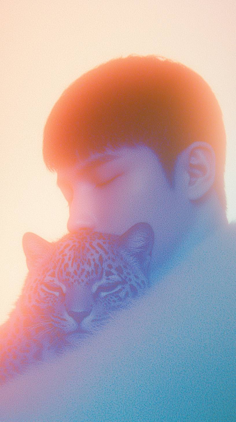 A blurry, faceless humanoid with dark hair holding the glowing purple silhouette of a leopard print Panther, set against a pink and purple gradient background, There are stars,in the style of Rinko Kawauchi. --ar 9:16 --quality 2 --style raw --sref 962970979 2581180571 --personalize kzilt9y --stylize 900 --v 6.1