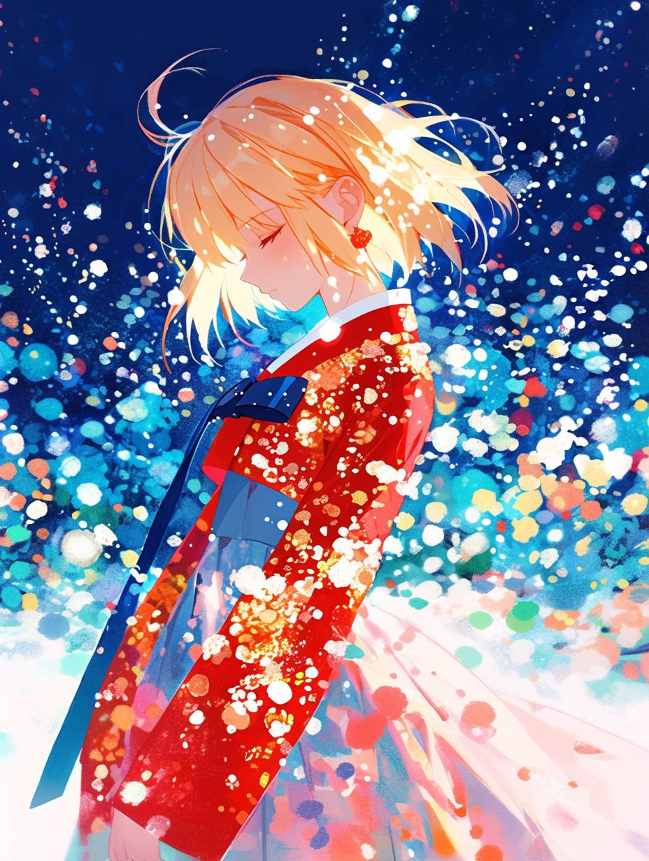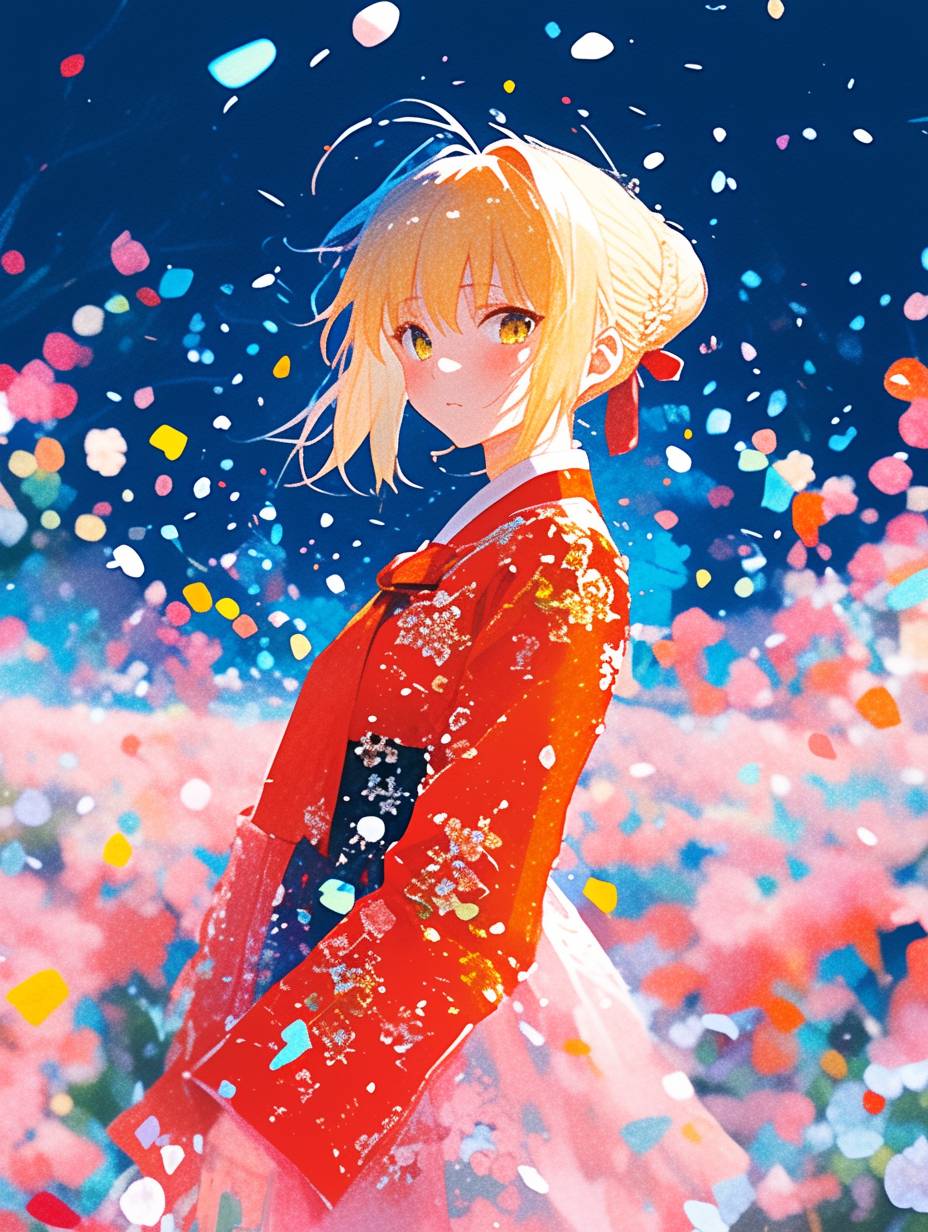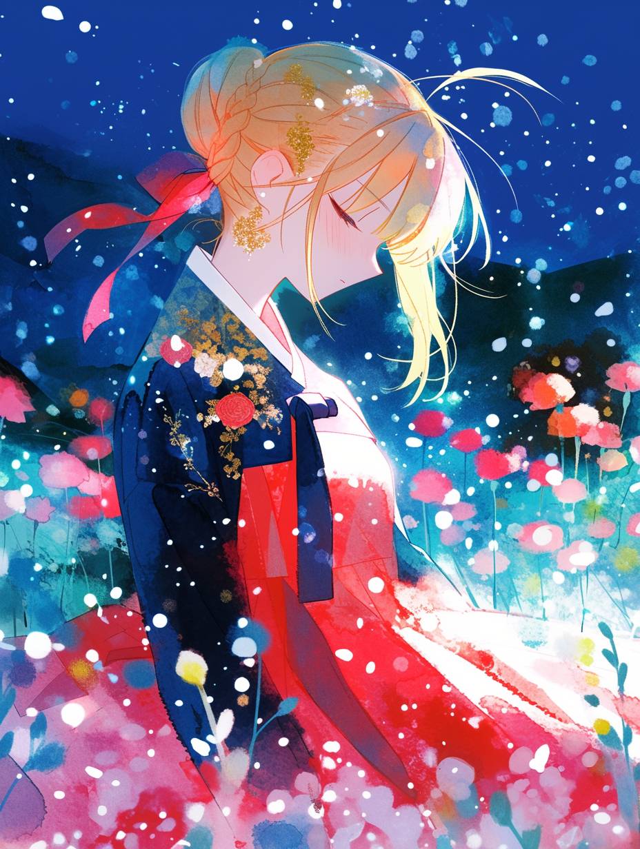 animation shot of a blonde woman wearing a red hanbok adorned with gold flowers lining. She is posing gracefully while standing carnation-pink floral garden under uranian-blue sky. The scene is backlit, creating a glowing effect around her, and features a shallow depth of field that softly blurs the background. --ar 3:4 --style raw --sref 4276896205 --stylize 1000 --niji 6