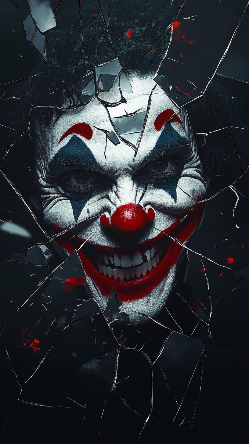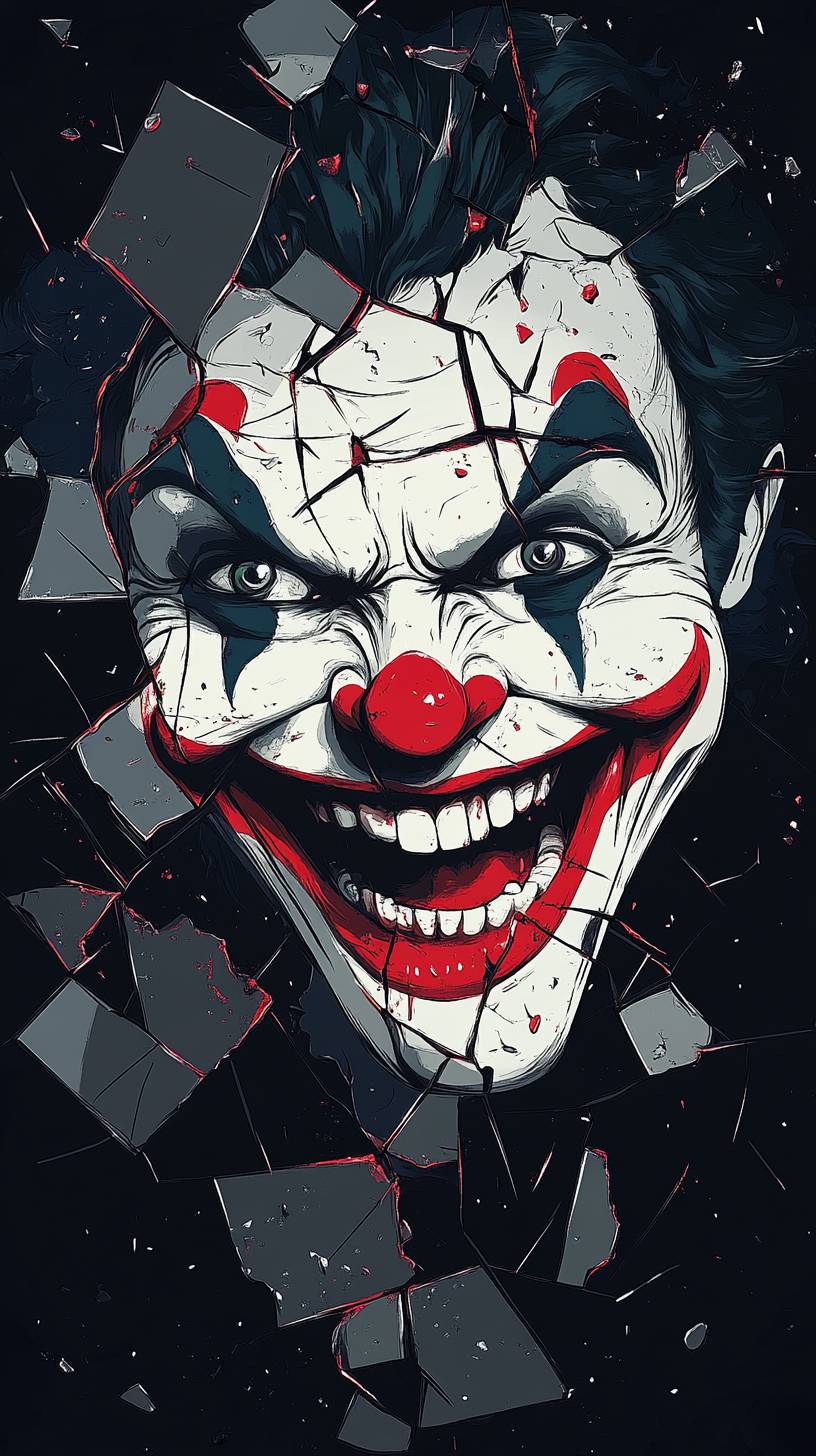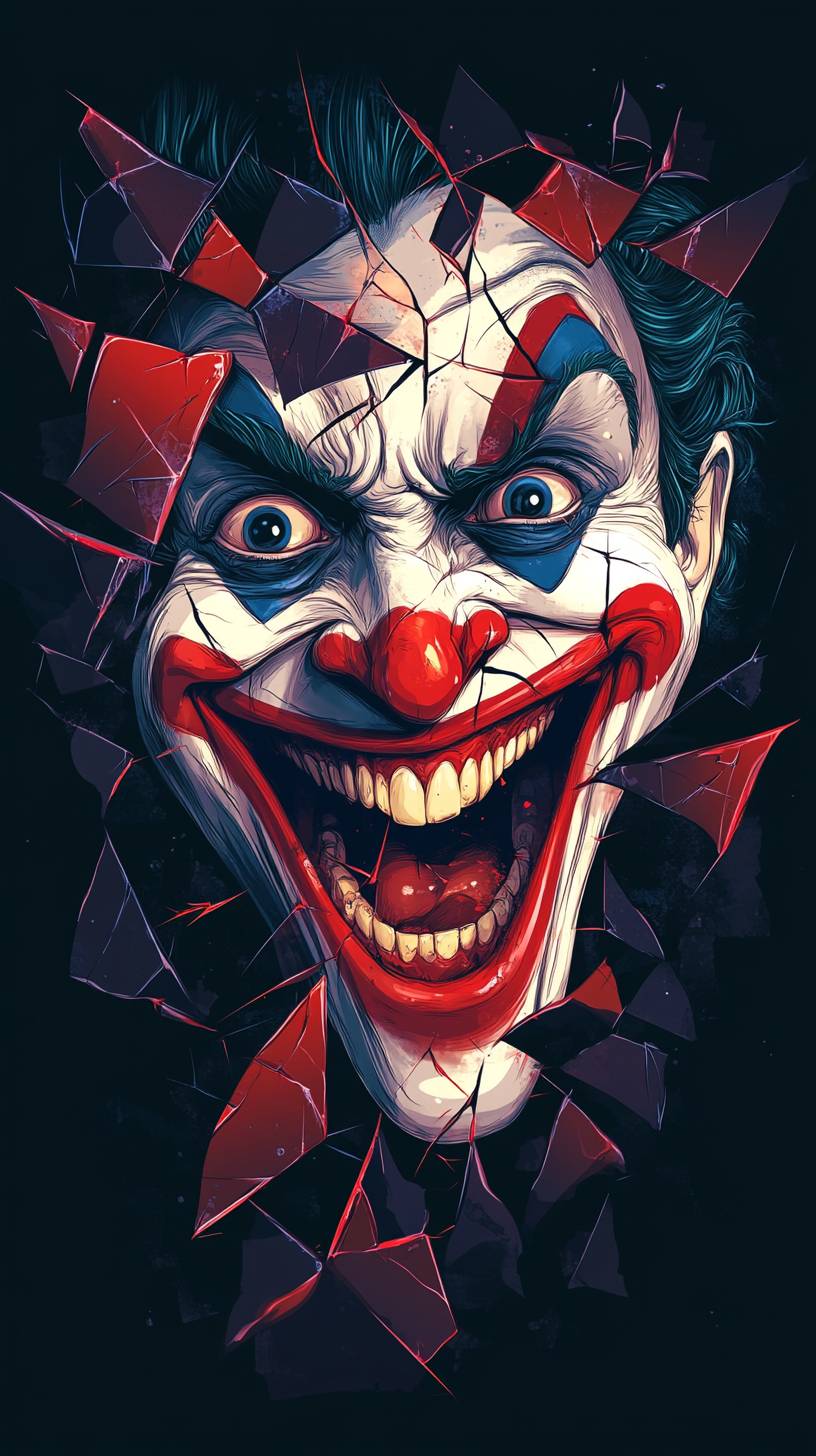 一个古怪的可爱小丑,带着夸张的笑容,通过破碎的镜子碎片展现出他的形象。每一片镜子都展示了他可爱而顽皮的面孔的不同部分,红色的细节突出了他的微笑。背景是黑色且极简的,让小丑碎片化而俏皮的表情成为主要焦点。设计简单却视觉上引人入胜,聚焦于迷人的破碎倒影。