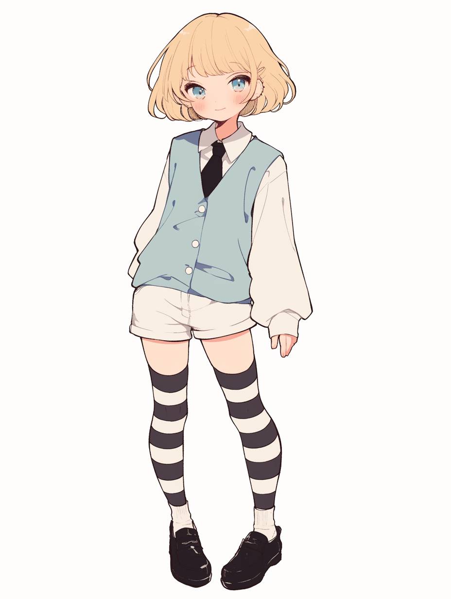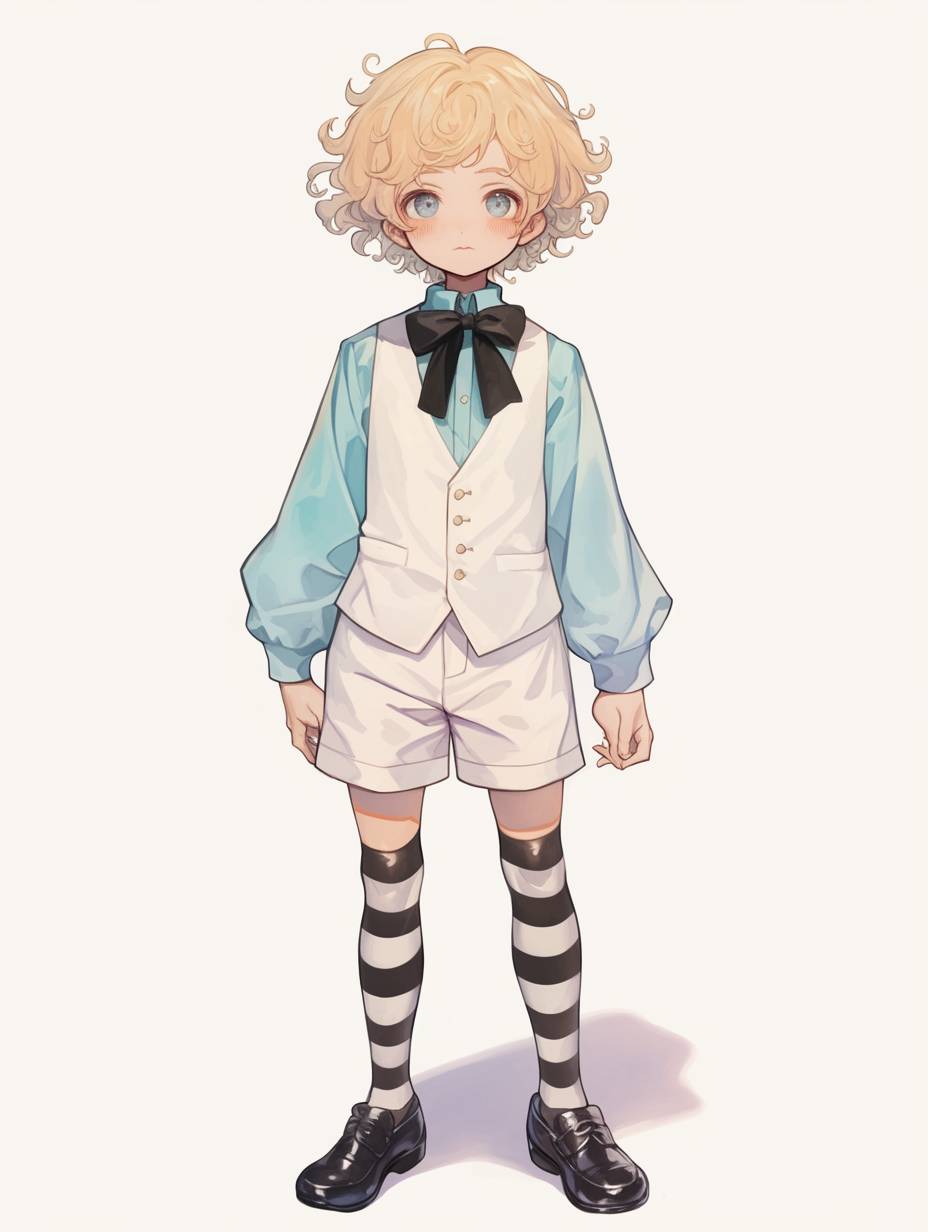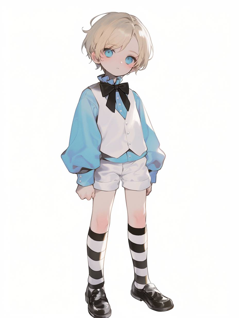 Full body, white background, a cute boy reminiscent of Alice in Wonderland, with blonde, straight short hair, wearing a light blue shirt, a white vest, white shorts, black and white striped socks, and black shoes. --ar 3:4 --niji 6