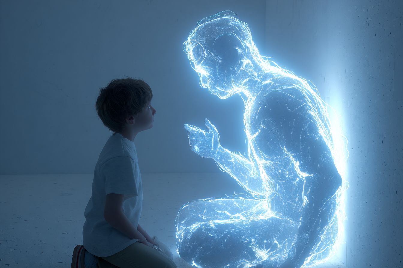 一幅描绘高我与孩子对话的画面,男孩在给予生活建议!动画真实,他们在一个纯白光辉的房间里。