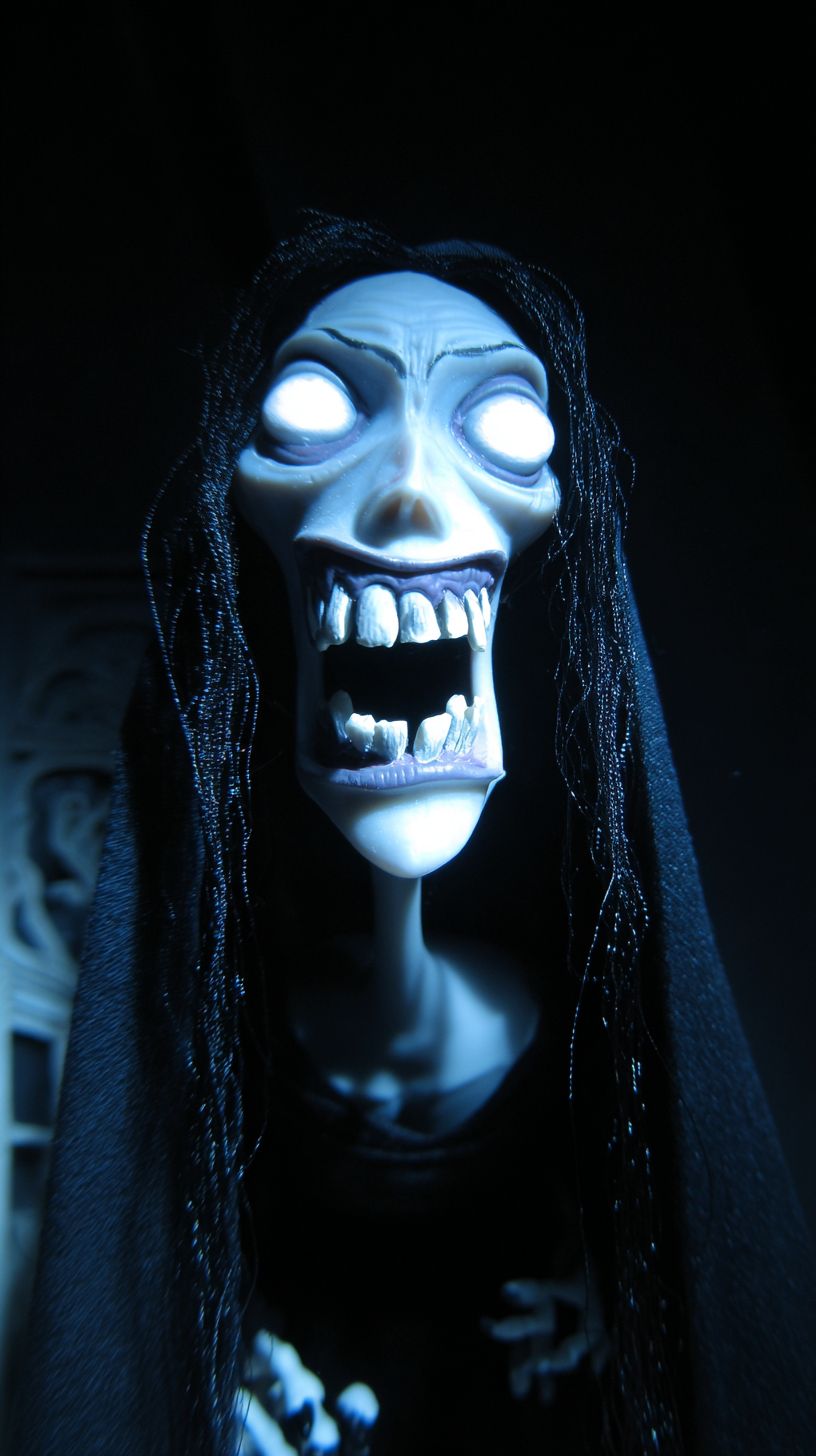 一个黑暗的童话,风格模仿蒂姆·波顿的定格动画,特写一名女性鬼魂(她的脸颊消瘦,皮肤呈病态的灰色。她的眼眶凹陷,无瞳孔,发出令人生畏的白光。最引人注目的是她夸张得张开的嘴,里面充满了无数尖锐不规则的哥特式象牙牙齿,仿佛随时准备撕扯她的猎物。她微微向前倾,传达出一种压倒性的优越感,长长的黑发像蛇一样向镜头滑动,披着黑色长袍,露出腐烂的躯体和众多的心脏。背景是混乱的黑暗(光线从下方诡异地照亮她的脸,增强了恐怖的效果,冷色调,低饱和度,昏暗的灯光),创造出视觉上令人印象深刻的插图。