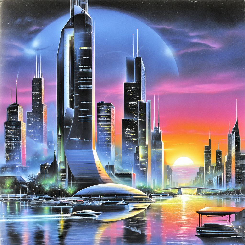 日落时分的芝加哥。未来城市。