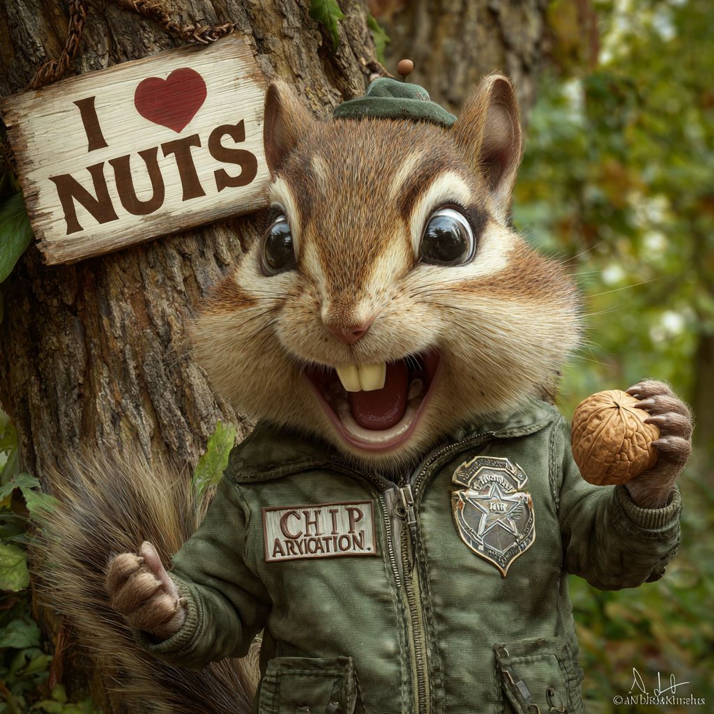 一只愤怒的松鼠穿着美国陆军航空夹克,露出笑容,手里举着一个胡桃,他的名字标签上写着“Chip”,背景树上的木牌上写着“我 ❤️ 坚果”。