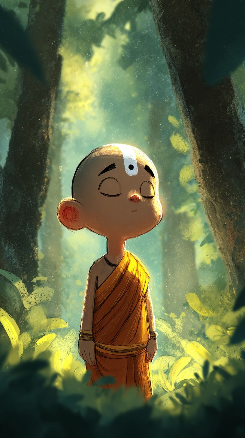 一个年轻的男孩,好奇而睁大眼睛,穿行在阳光明媚的森林中,周围是高大的树木。阿迪·香卡拉,古印度哲学家,以柔和的动画故事书风格描绘,比例温和,年轻的面孔和平静的神情,光头,额头上有三条横向的白色涂抹线,闭眼静坐,穿着简单的藏红色/橙色袍子,伴有画笔笔触和柔和的阴影。温暖的阳光透过树木,投射出柔和的斑驳光影在叶子上,创造出一种宜人而宁静的氛围,电影般的构图,没有现代元素,且没有文字。