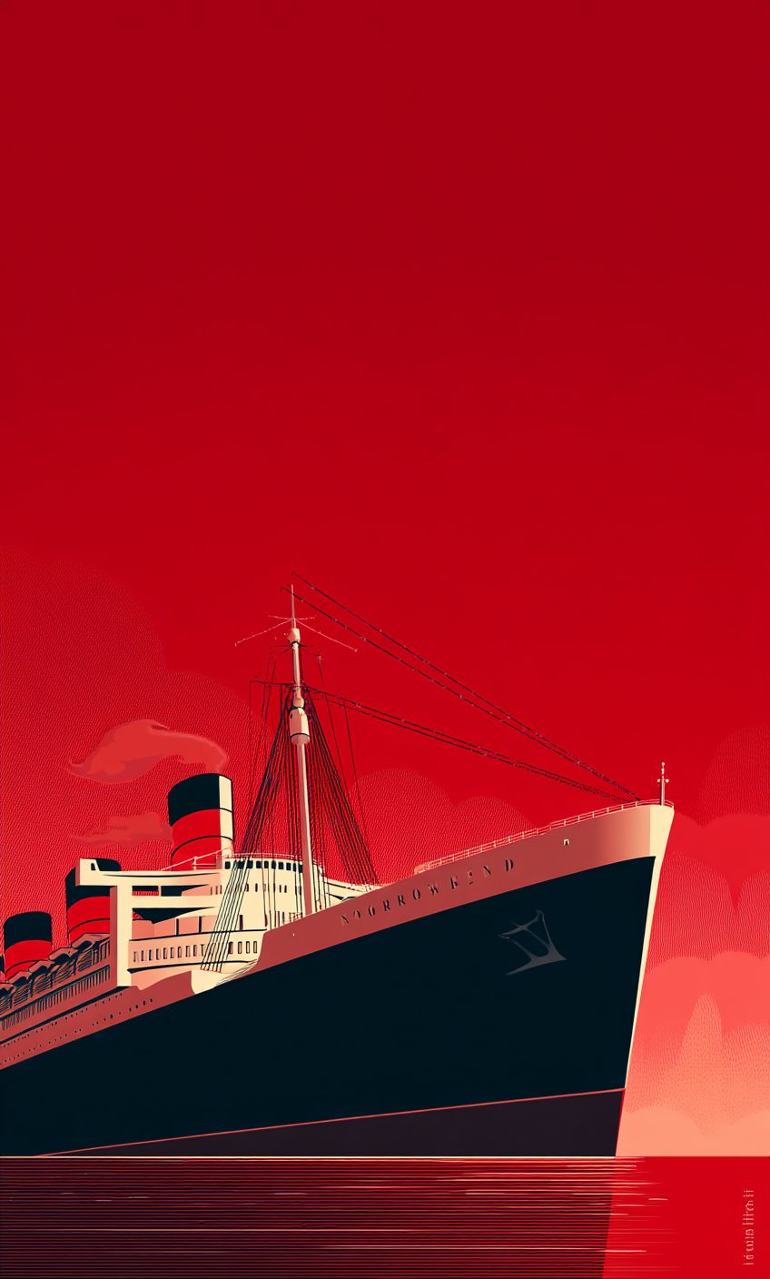 在页面右侧以红色突出显示单词 "n hin nstarts" 的 C 指纹。一幅插图 featuring 一艘名为 Norwegian Dorsel 的远洋轮船,船首有好莱坞塔。背景是从深红到浅红的渐变。矢量图形,简单的形状,扁平设计,数字艺术风格。高分辨率,高细节,专业质量。该艺术作品使用矢量图形软件如 Illustrator 或 Adobe Illustrator 创建,独立于柔和色彩背景。
