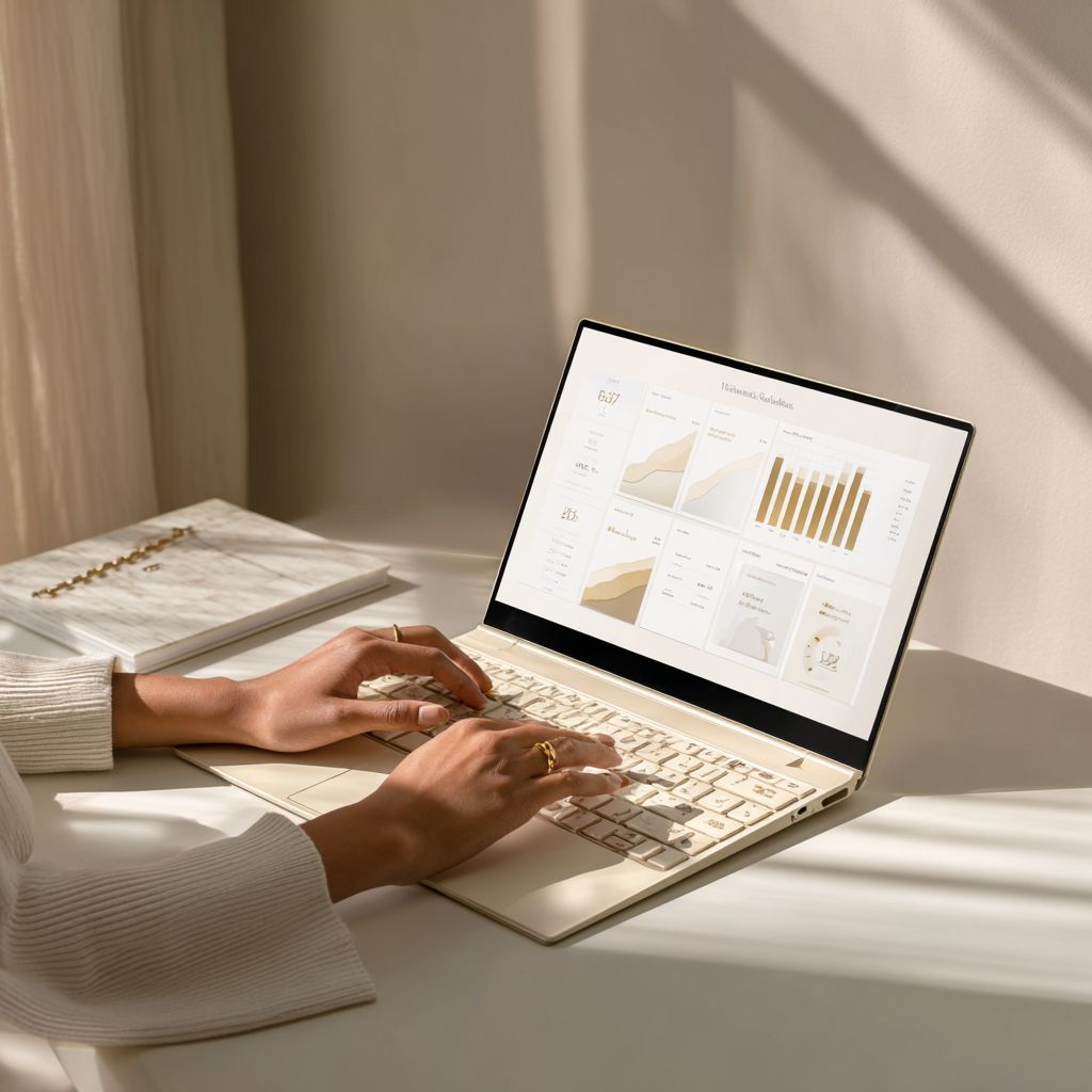奢华的企业战略概念,双手在笔记本电脑上打字,屏幕上有图表和关键绩效指标,米色和金色的迈克尔·科尔斯美学,干净简约的工作空间,柔和的自然光线,优雅的商务摄影,照片写实风格