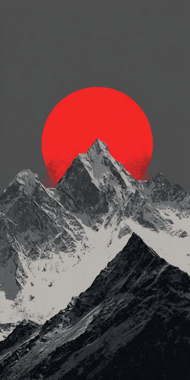 电影感极简山地风景,锯齿状的雪盖山峰,暗灰色调,中央山脉后面升起巨大发光的红太阳,深红色与深 charcoal 天空之间的戏剧性对比,情绪化和氛围感,绘画风格的数字艺术,锋利的轮廓,高细节山脉纹理,史诗般的规模,平静而强大的气息,优质壁纸美学,大面积空白天空区域供 iOS 锁屏时钟使用,干净的构图,主体置于下框。