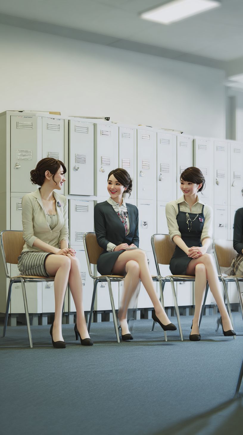 超写实,纵向构图,三位美丽的日本女白领在公司休息室里的白天休息,坐在简单的金属折叠椅上,愉快地聊天和微笑,三位女性从头到脚均可见,穿着清洁整齐的办公裙装(迷你裙风格)和高跟鞋,展现出既女性化又职业化的形象,场景中没有桌子,背景有排列整齐的储物柜,明亮的日间室内照明,自然的表情,友好的氛围,现代日本办公室室内,高度细致,真实的皮肤质感,清晰对焦。