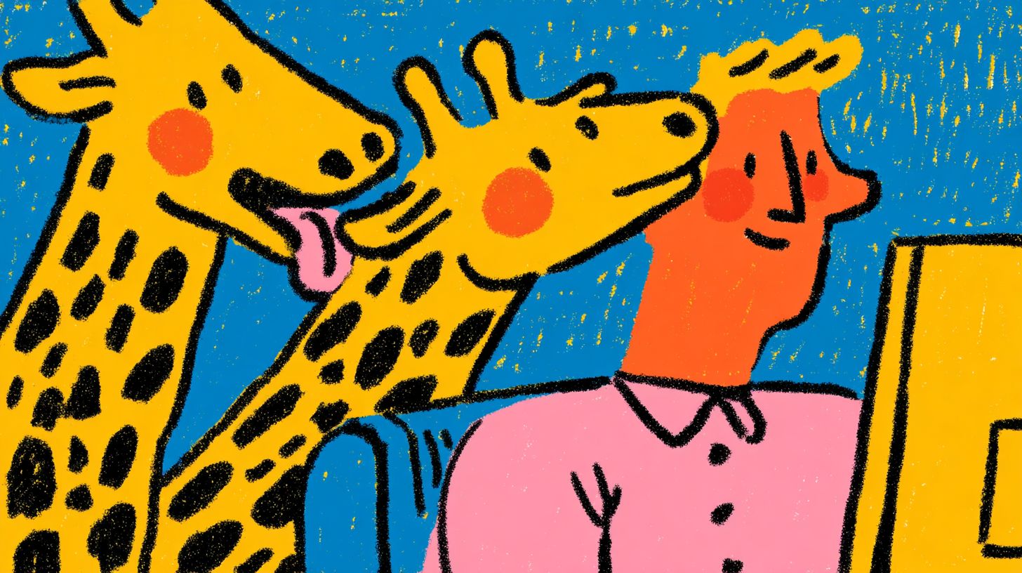 一幅卡通插图以简单大胆的风格描绘了一个人坐在电脑前的桌子旁。两只长颈鹿与这个人互动。一只长颈鹿的头位于这个人头部的后面,嘴巴张开,似乎在说话或亲昵。第二只较小的长颈鹿在这个人面前,头和脖子伸过这个人的肩膀,调皮地伸出舌头。背景是明亮的蓝色,带有微妙的纹理效果。这个人穿着粉色的衬衫和蓝色的裤子,坐在一把蓝色的椅子上。整体印象是异想天开和幽默的。
