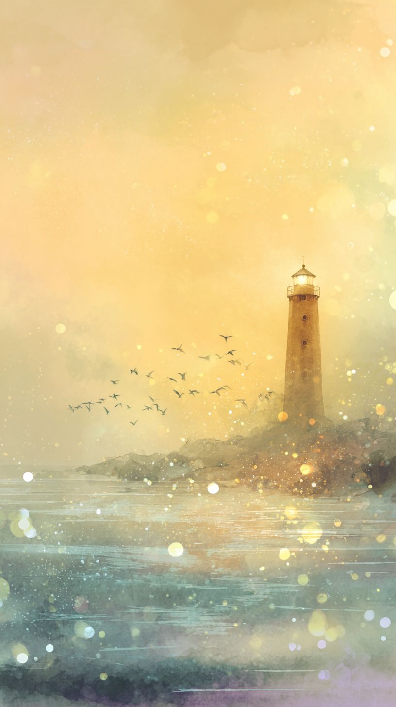 海岸线上的灯塔在柔和的雾气中发出温暖的光芒,温柔的波浪和海面上闪烁的光点环绕着灯塔,模糊的海鸟点缀着这一场景,呈现出梦幻的水彩风格。