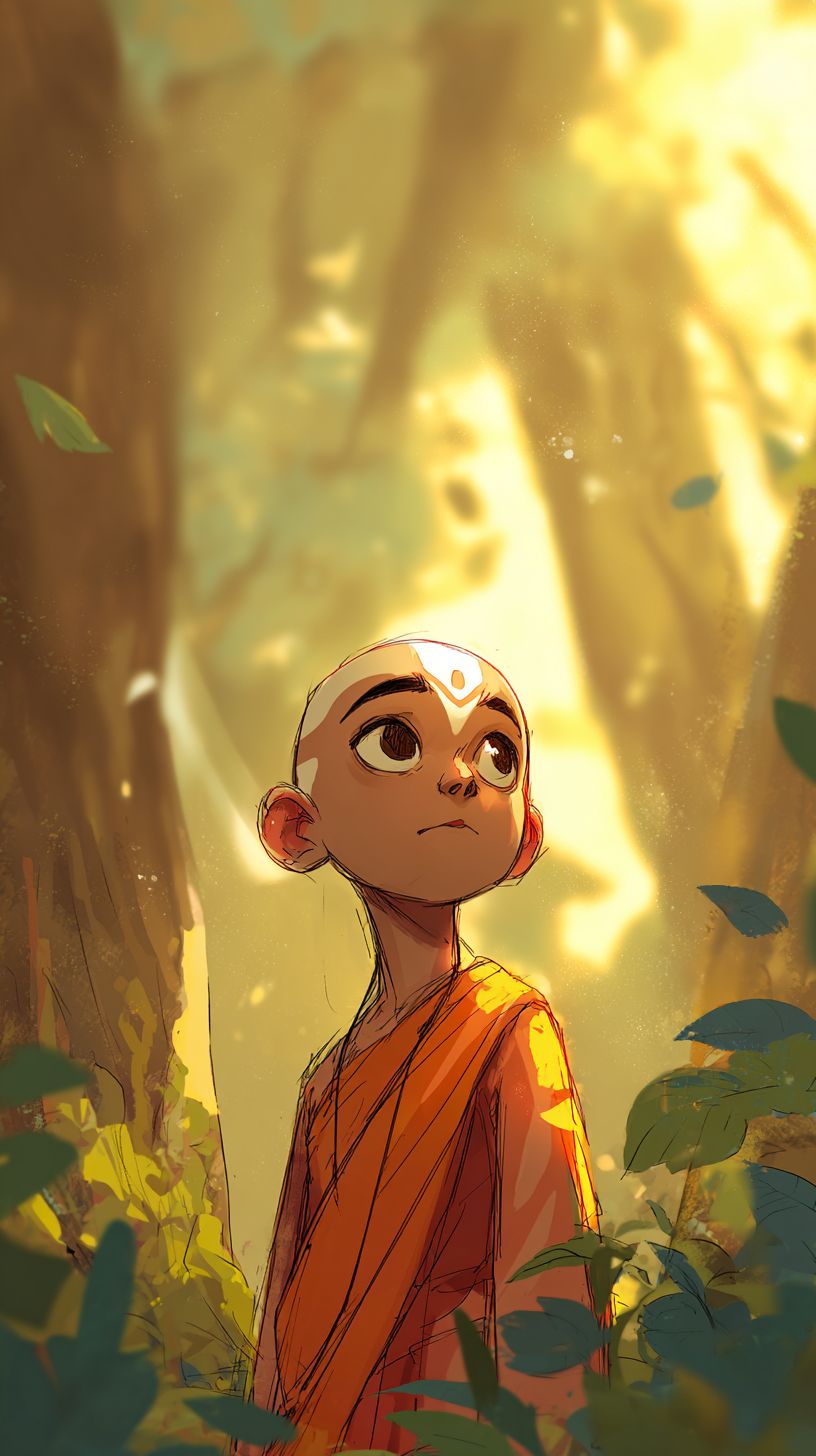 一个年轻的男孩,充满好奇和宽广的眼睛,漫步在阳光明媚的森林中,树木高大。阿迪·香卡拉,古印度哲学家,以柔和的动画故事书风格呈现,比例温和,面孔年轻而宁静,光头额头上有三条水平的白色粉末线,闭眼静心冥想,穿着简单的藏红色/橙色长袍,带有画笔笔触和柔和的阴影。温暖的阳光透过树木,洒在叶子上,创造出温馨而宁静的氛围,电影般的构图,没有现代元素,没有文字。