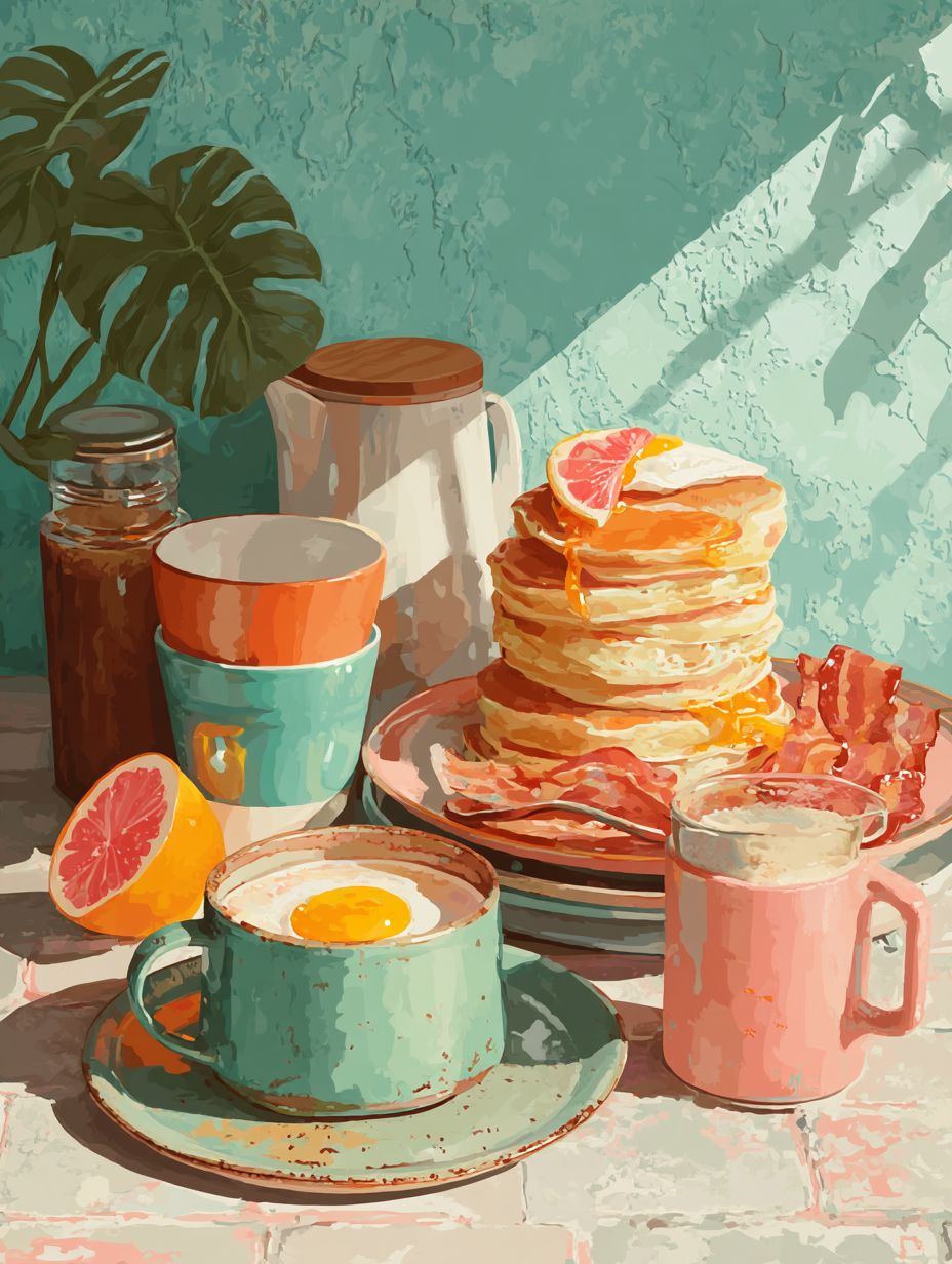 色彩丰富的厨房墙面艺术插图,现代平面插图,带有绘画质感,舒适的食物静物,鲜艳的色彩调色板,柔和的笔触,最小的阴影,装饰性的构图,现代民俗艺术风格,柔和的背景,温暖而愉快的氛围,高细节,经典美国早餐插图,煎饼、培根和鸡蛋、咖啡杯,现代平面插图,鲜艳的粉彩颜色,柔软的画作质感,舒适的早晨氛围,装饰性的厨房墙面艺术