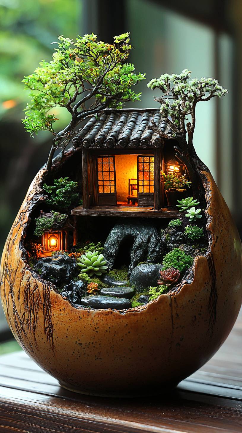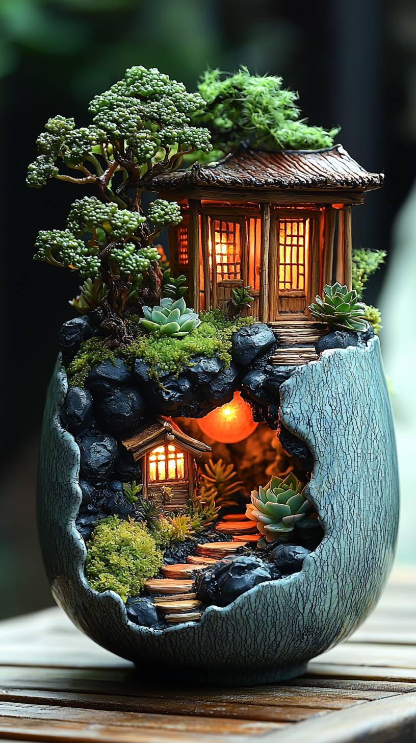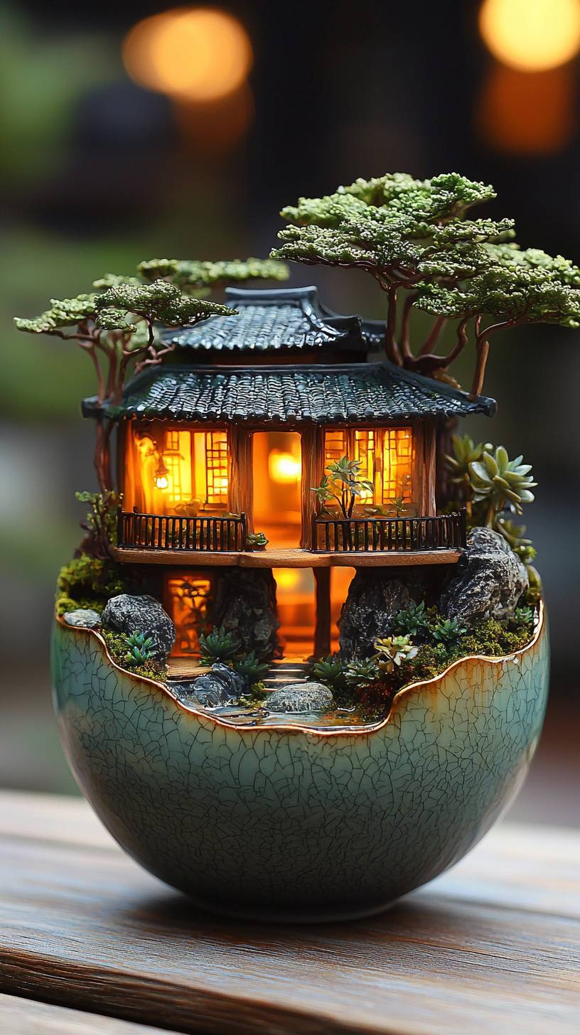 On the night of the Mid-Autumn Festival, the moon was bright in the sky. A Jingdezhen porcelain teacup was placed on the table outside. Inside the teacup was a micro landscape with moss, succulents, small volcanic stones, and a small wooden house with lights on. --ar 9:16 --quality 2 --stylize 750 --v 6.1