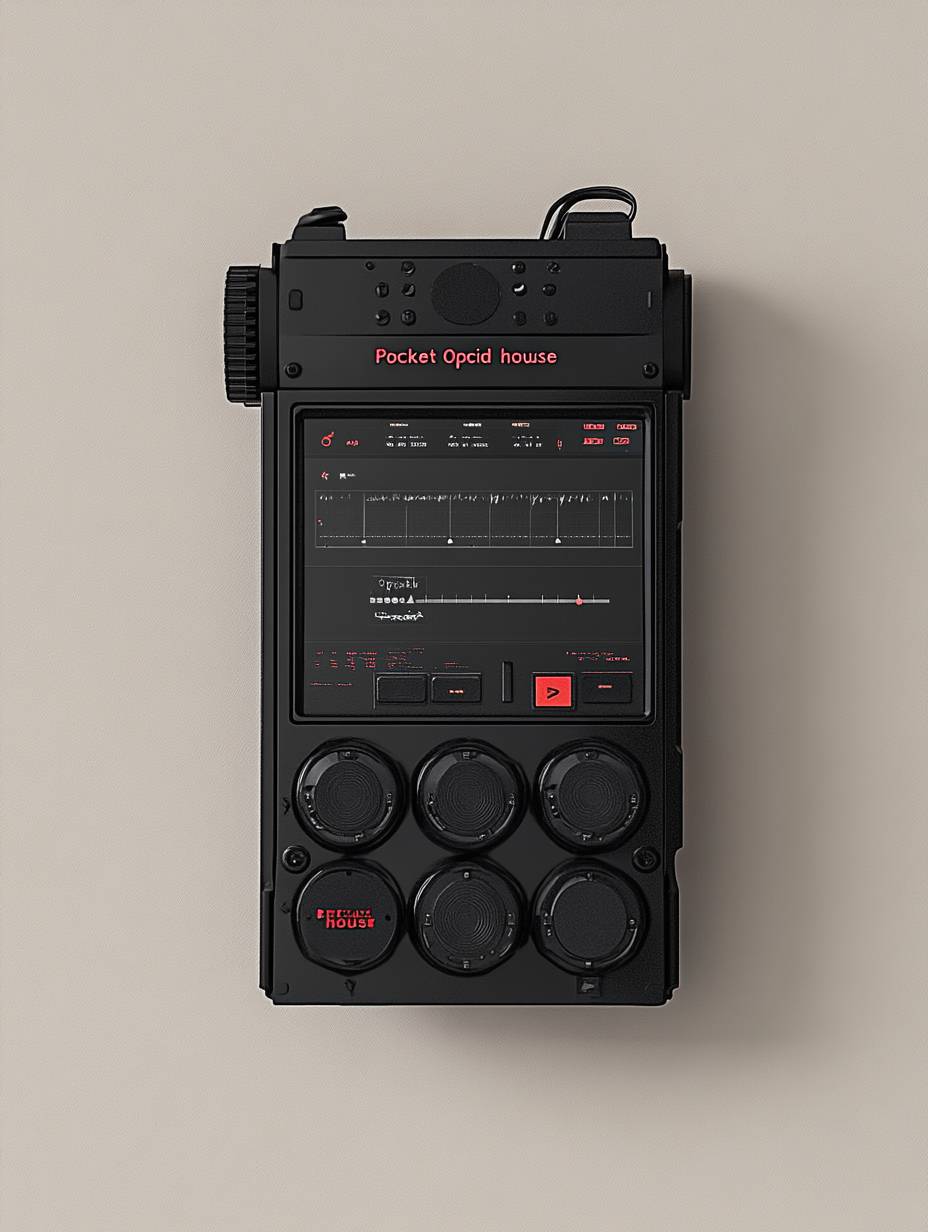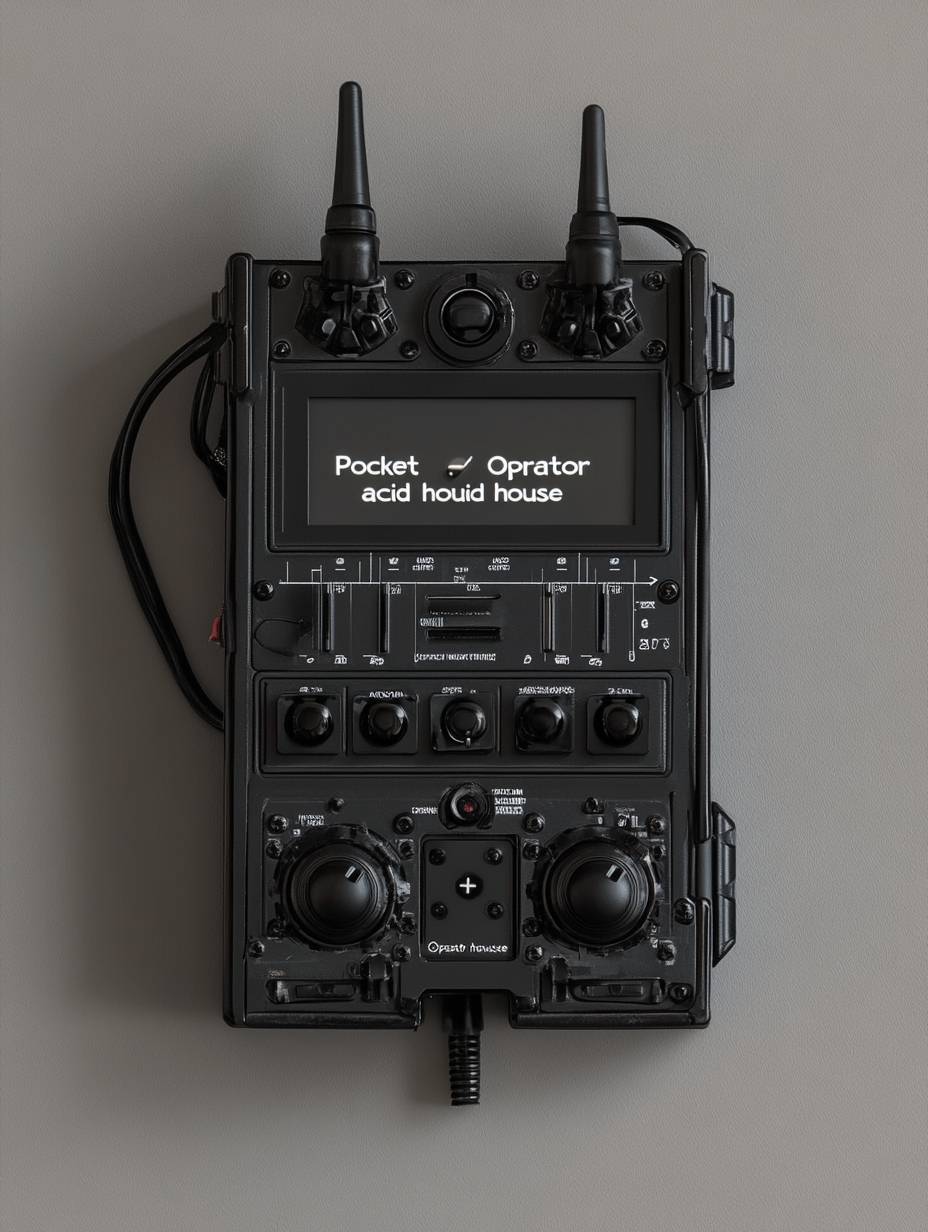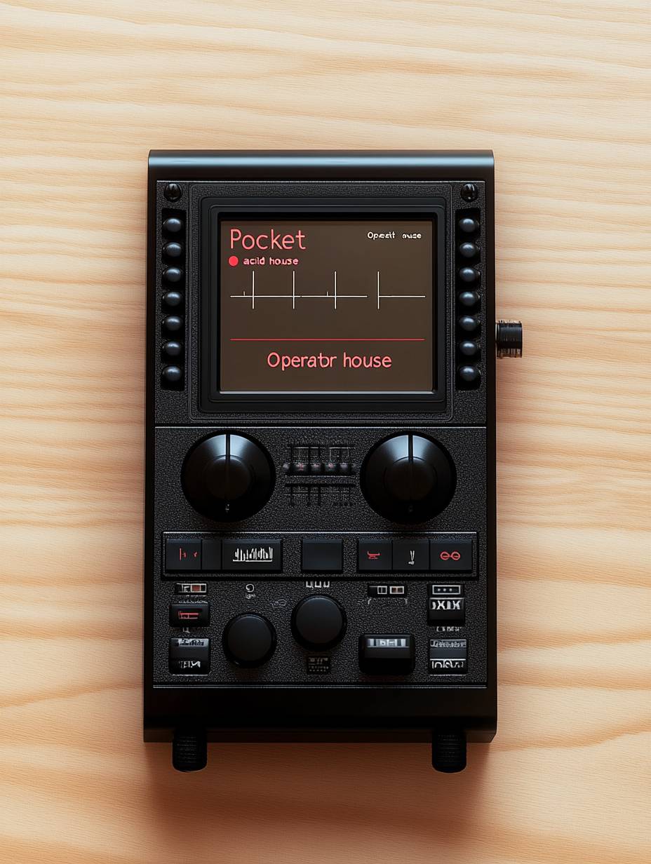 從上方視角來看,「口袋操作員」是一個電子設備,配備兩個大按鈕和一個顯示音樂的屏幕,其中還包括「酸屋」字樣,設計風格來自青少年工程。它由黑色塑料和金屬裝飾製成,打開時高度約為五英寸。