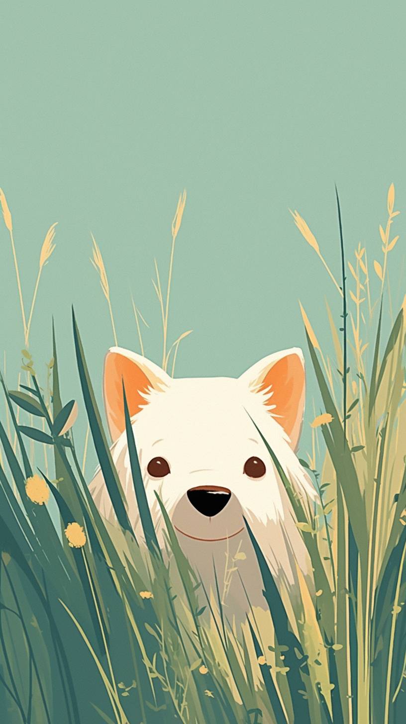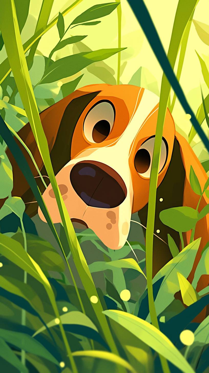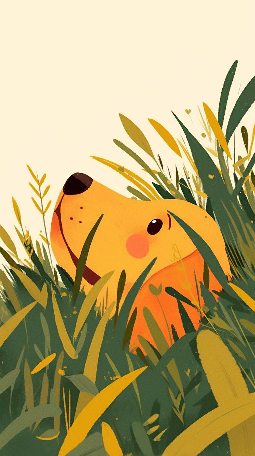 A cute dog hiding in the grass, flat illustration style, simple lines, minimal details, minimalist background, green color scheme, children's book illustrations, flat illustration, cartoon, high resolution, high definition --ar 9:16 --niji 6